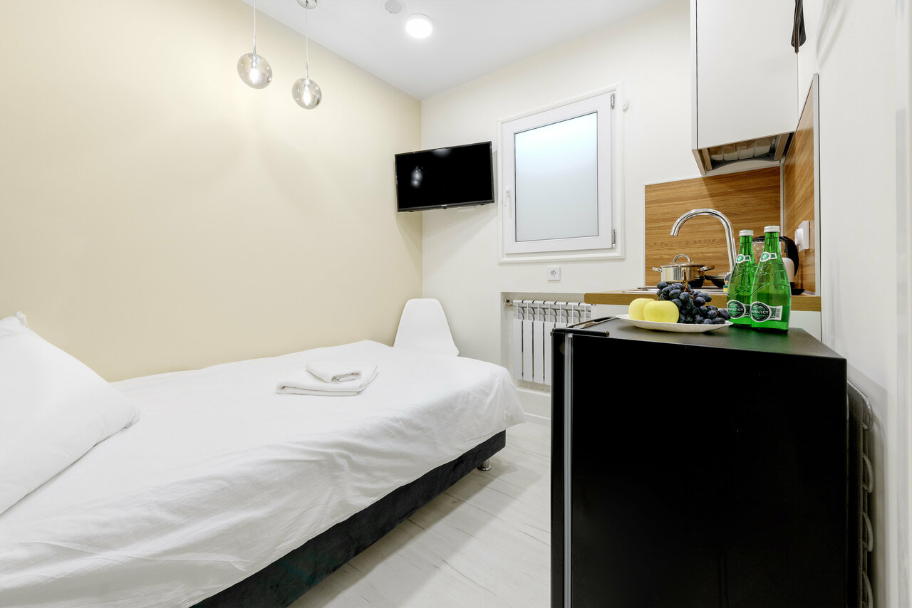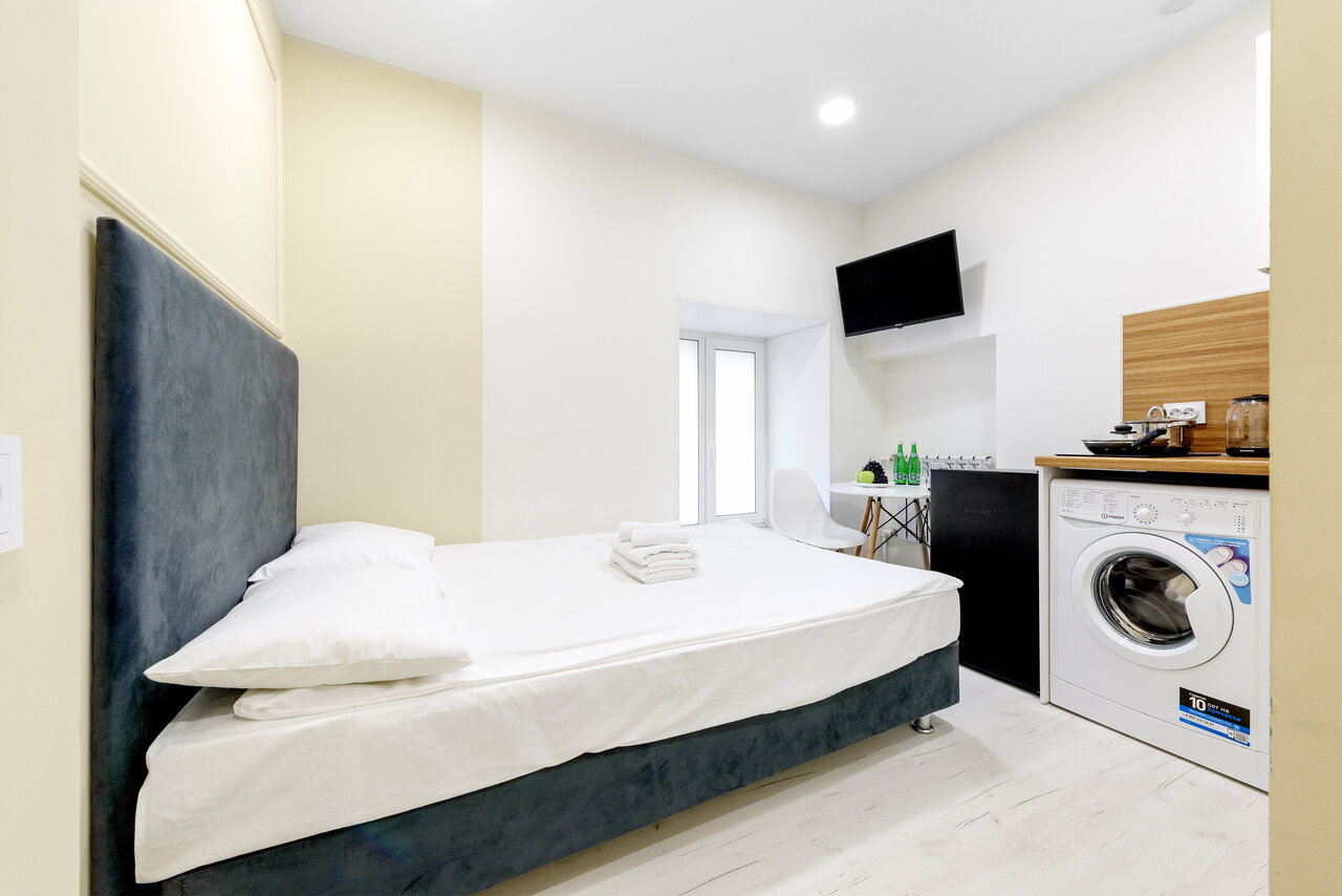 Местоположение удобное — рядом метро, московский жд вокзал. В номере есть плита, холодильник, телевизор, фен, посуда для готовки. Стиральная машина. Кровать удобная. В коридоре гладильная доска и фен. Сам номер идеален, чтобы отдохнуть, освежиться, перекусить. Для одиночного размещения подходит. Душевая кабина совмещённая с туалетом в одном помещении. Заселение бесконтактное. Недостатки тоже есть — абсолютная духота, нет вытяжки и вентиляции, можно поставить вентилятор, но это не помогает. Окна нет в номере, на фото декоративное. Открыть дверь, чтобы был воздухообмен не особо помогает — в коридоре ещё жарче. Если поставить Бризер в стену, будет хоть какой-то воздухообмен. И не было даже вешалки, где можно разместить одежду. Не говоря о том, чтобы где-то её повесить после стирки. В более прохладное время года скорее всего очень комфортно, но в жару — тяжело, что ночью, что особенно днём.