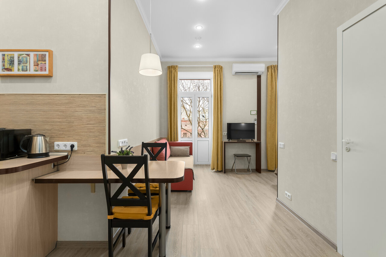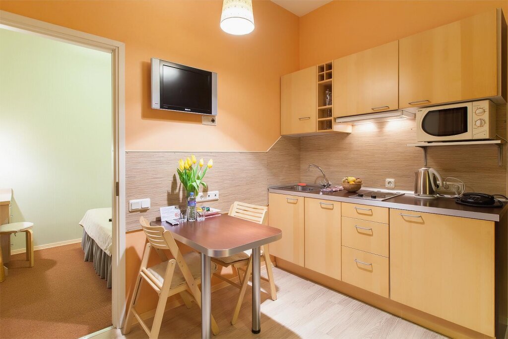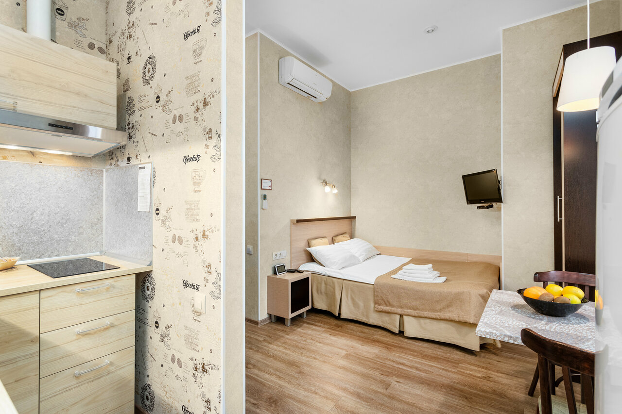 Хорошее место для тех, кому нужны именно апартаменты. В номерах есть все: кухня, посудомоечная машина, стиральная машина — можно жить, как в квартире, в центре города.