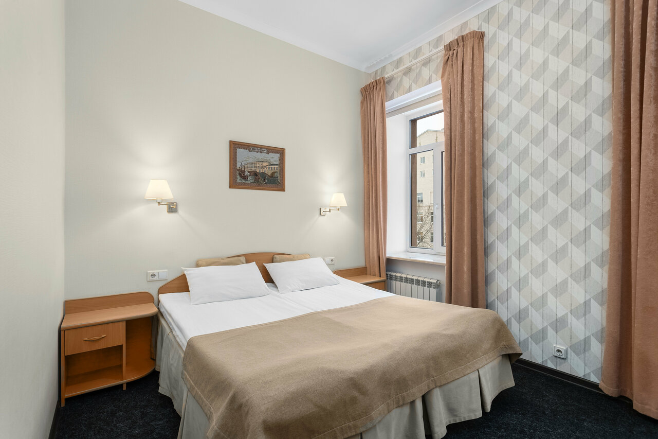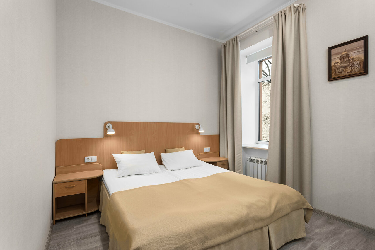 Жили в этой гостинице в начале октября 4 дня. Все очень понравилось, удобное распололение 500 м до метро, приветливый персонал. Гостиница находится в глубине двора, Невского проспекта не слышно, только шум деревьев. Чистый просторный номер, новое белоснежное белье(сатин) и полотенца, рабочая сантехника, отсутствие плесени в ванной. Кровать в меру жеская, не скрипучая, матрас не продавленые. Отличная шумоизоляция, соседей не слышно совсем. В номере есть ТВ, холодильник, чайник, кондиционер, обогреватель, кружки и чай с сахаром. Также попить чая и кофе из кофемашины можно на ресепшн — бесплатно, что очень радует. Уборка каждый день, пополняются туалетные и чайные принадлежности. Из минусов отметил бы отсутствие недорогой столовой на первом этаже гостиницы)) Но думаю, это мои придирки. Столовая N1 где-то в 300 метрах. Проживанием остались довольны. Рекомендую всем.