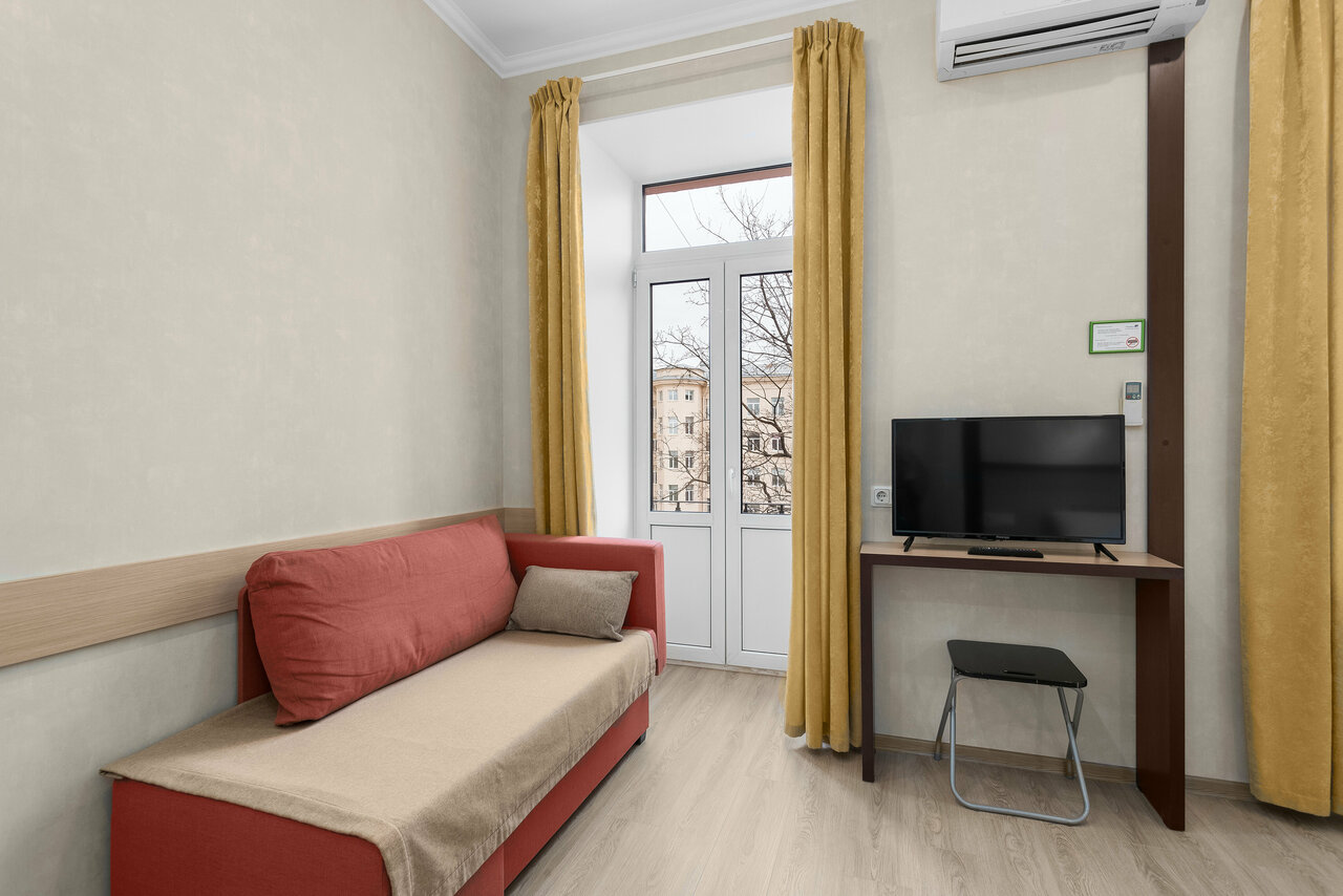 Двухкомнатные или однокомнатные апартаменты с собственной кухней и ванной комнатой с ванной с видом на тихий зеленый дворик. Апартаменты расположены на 4-м этаже.В апартаментах имеются: мини-кухня, кондиционер, телевизор, беспроводной интернет.