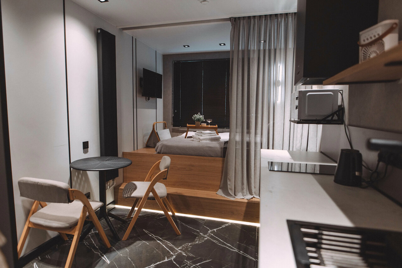 Отель в центре города, рядом много магазинов, кафе, рестораны. Студия чистая, современная, уютная, все необходимое есть для комфортного проживания. Жить там одно удовольствие, обязательно вернусь.