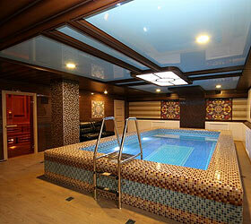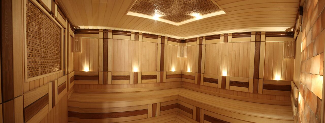 Сауна включает в себя финскую парную, хамам, большой подогреваемый бассейн, спальню и просторную зону отдыха.