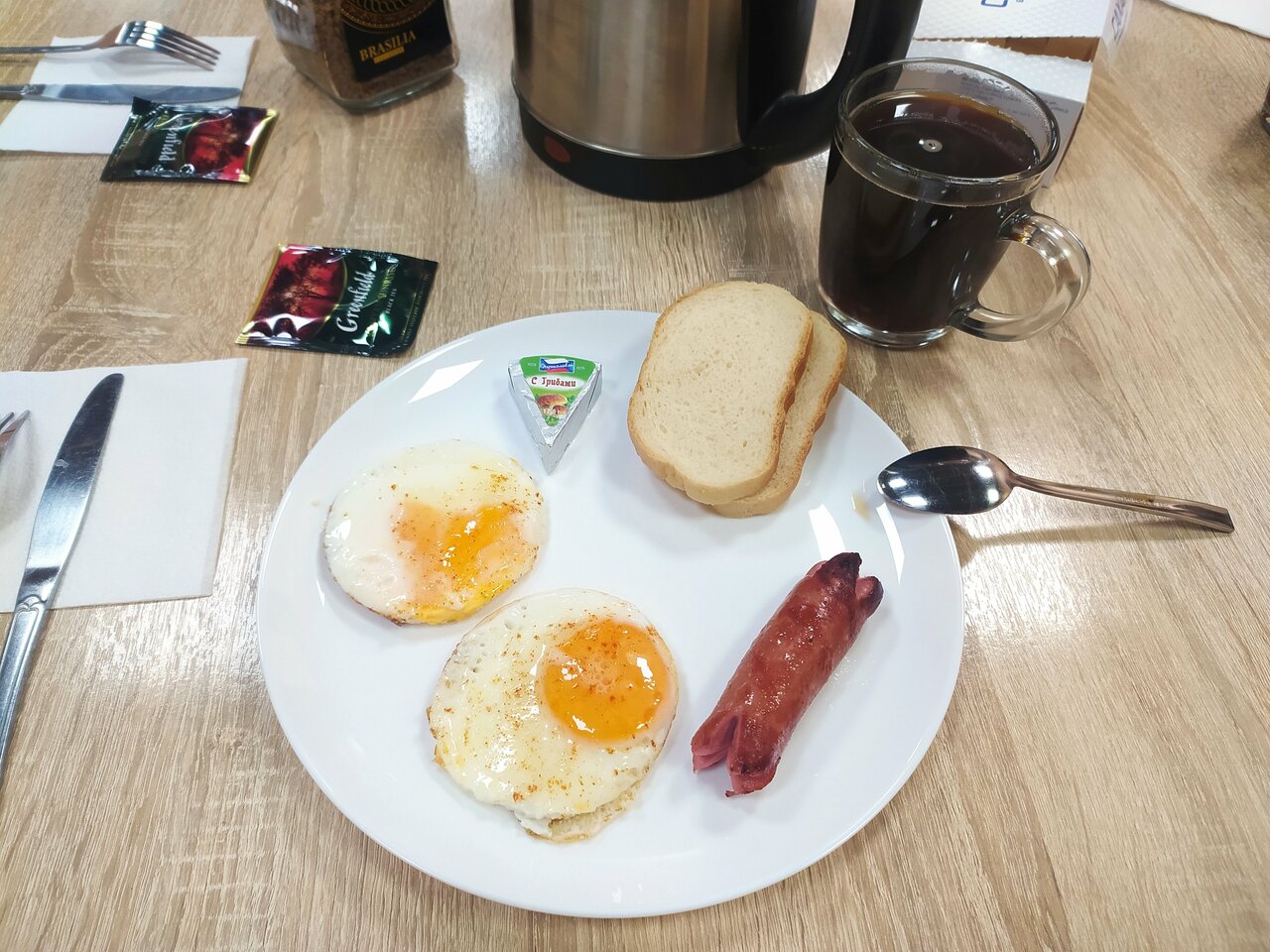 Для ночлега пойдет. Ехали из Краснодара в Казань, останавливались ночевать. При заселении у нас попросили выбрать завтрак — яичницу или блины с творогом. Выбрали яичницу. Приготовили одну, потом вторую пожарили после просьбы. В целом, передохнуть после тысячи км — пойдет.