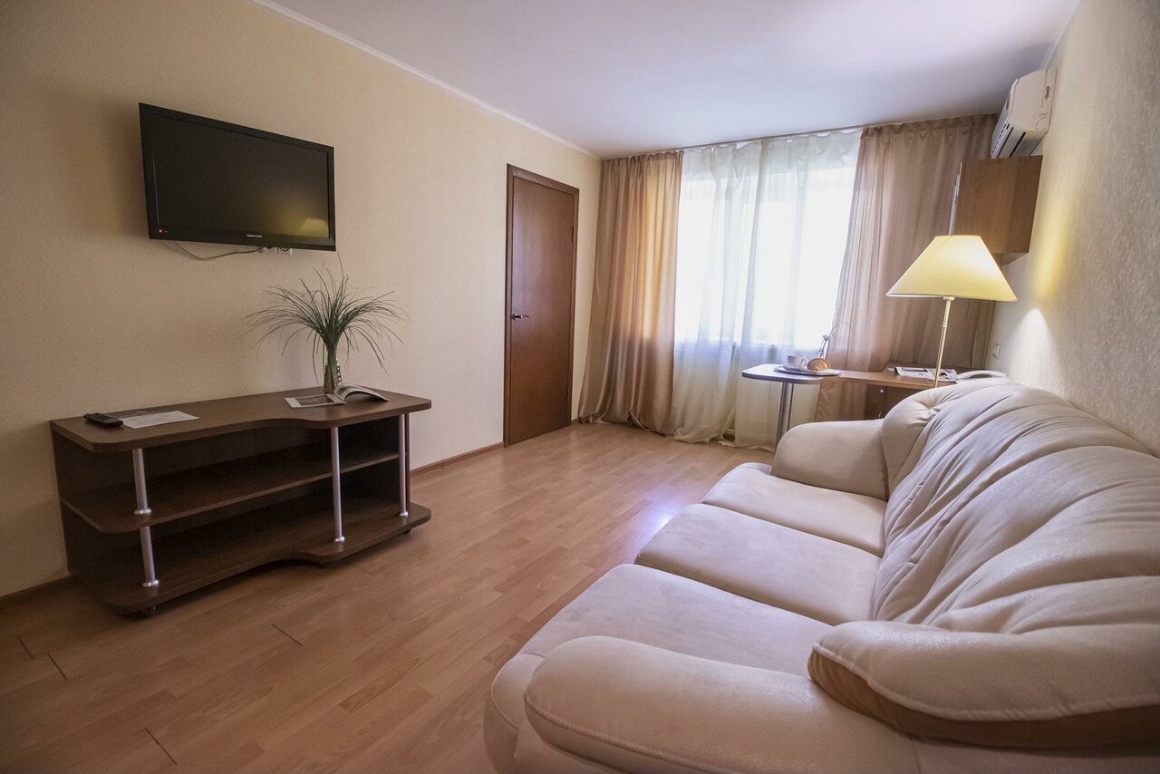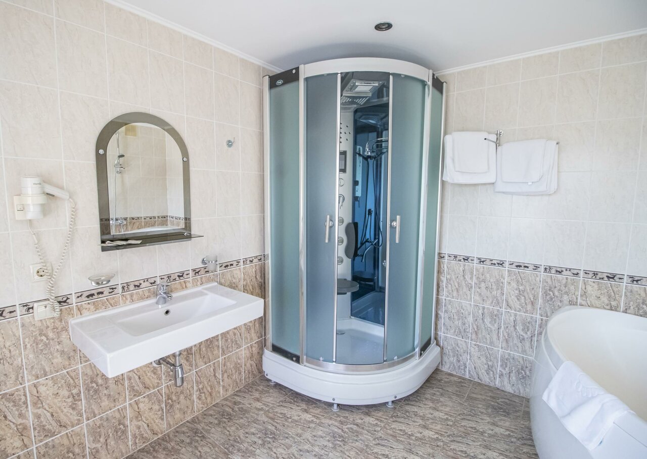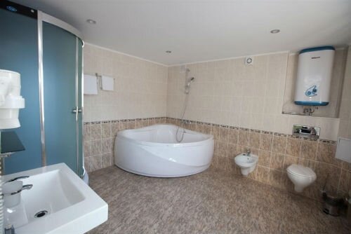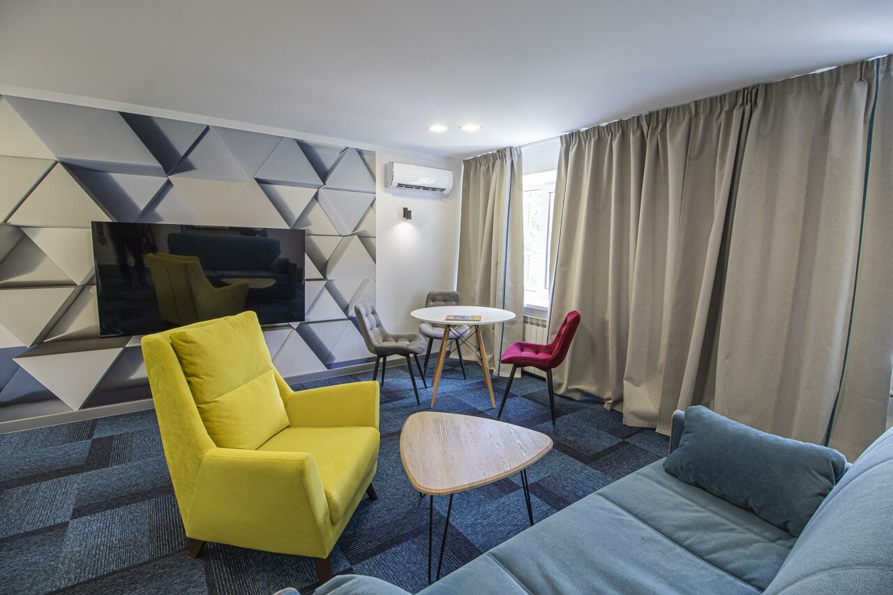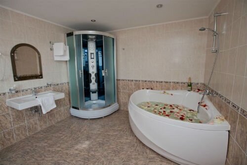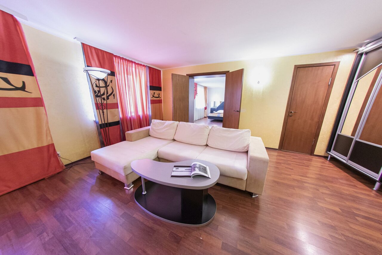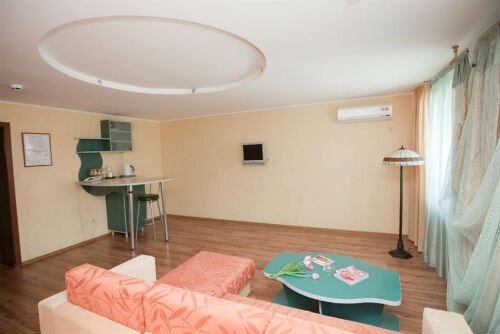 Номер Люкс (lux) - площадью 40 кв.м., состоящий из двух жилых комнат - гостиной и спальни - и двух санузлов.Номер вмещает до четырех гостей и оборудован кондиционером, дизайнерской ванной комнатой, большой душевой кабиной и теплым полом во всем ном