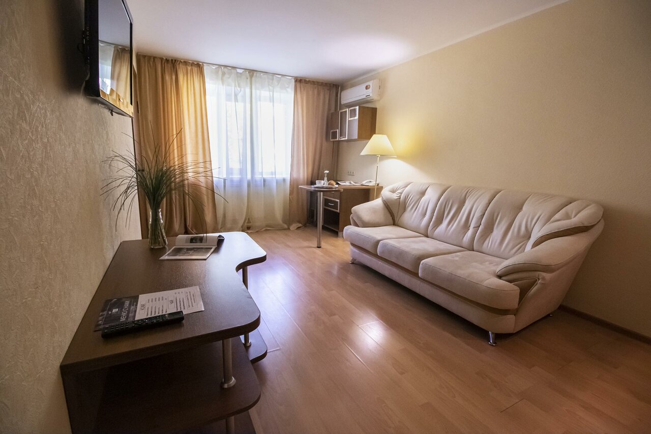 Гостиная-спальня повышенного комфорта для одноместного размещения.Номер располагает полутороспальной кроватью, сейфом, мини-баром. В санузле оборудован теплый пол.