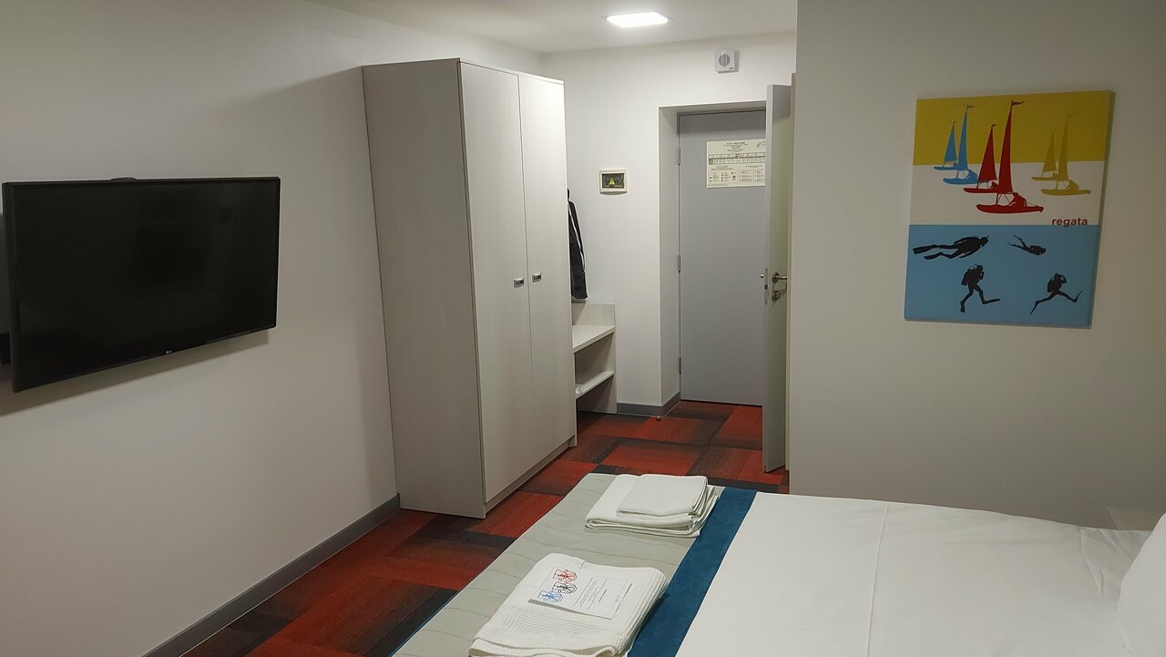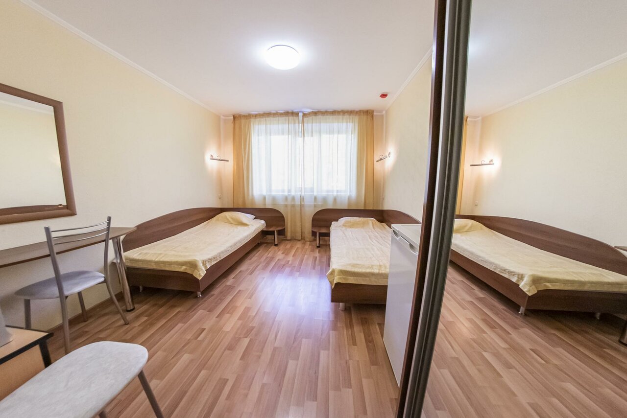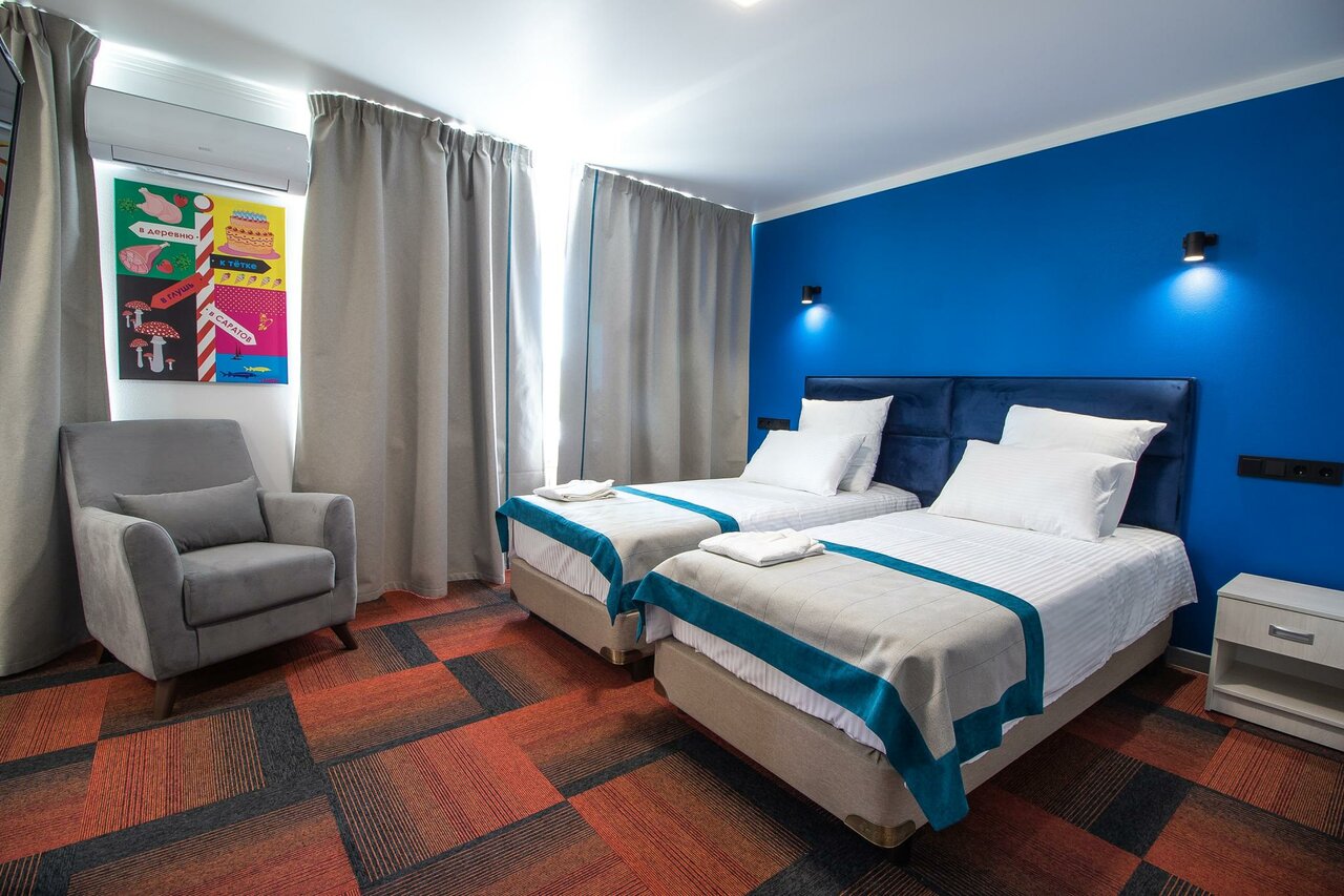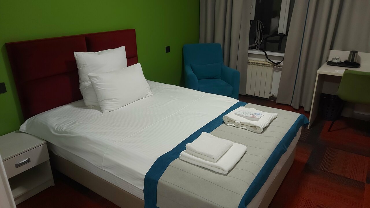 Комфортный номер для одноместного или двухместного размещения.Кровать трансформируется из одной двуспальной в две односпальные по желанию гостя.