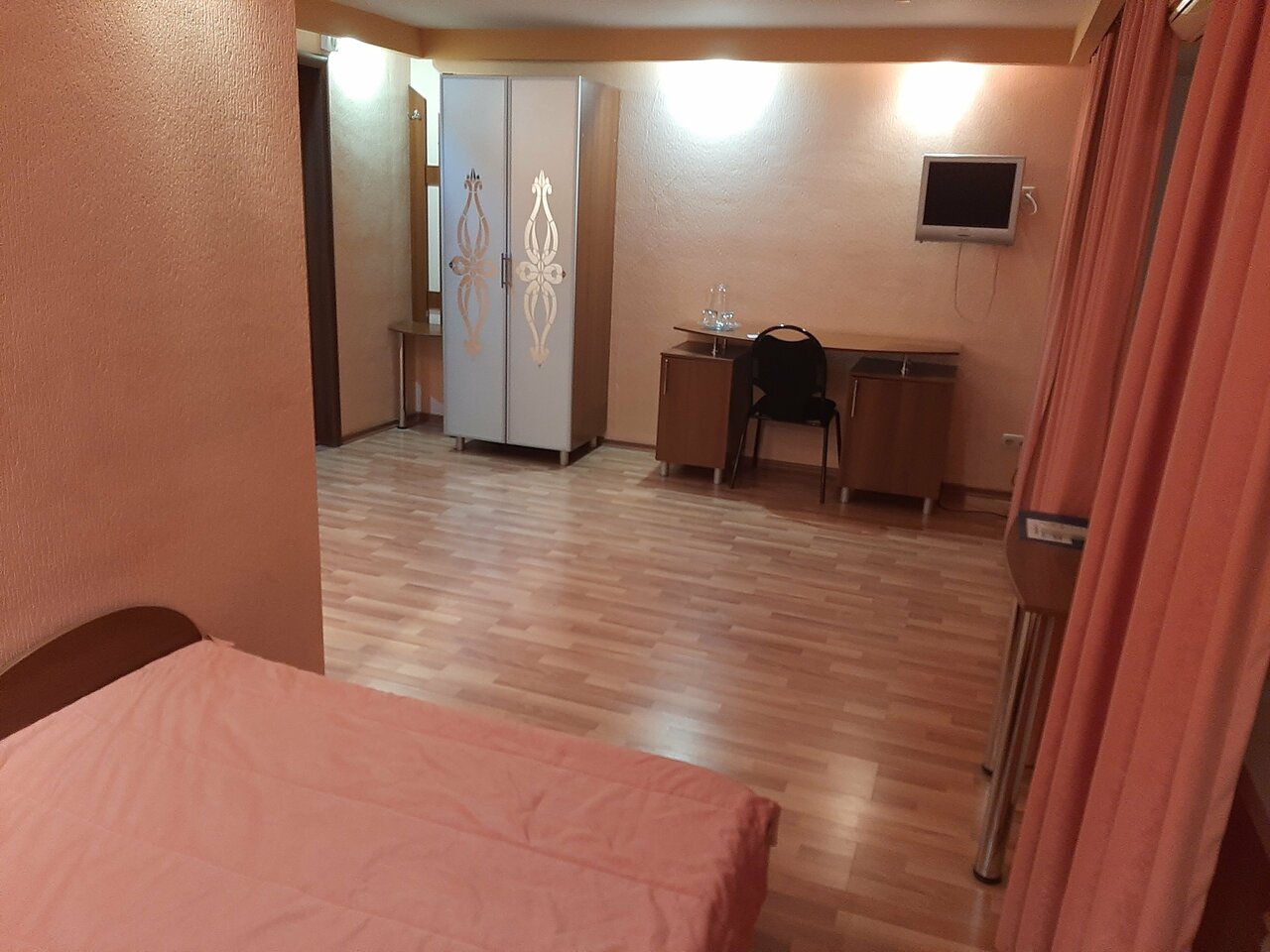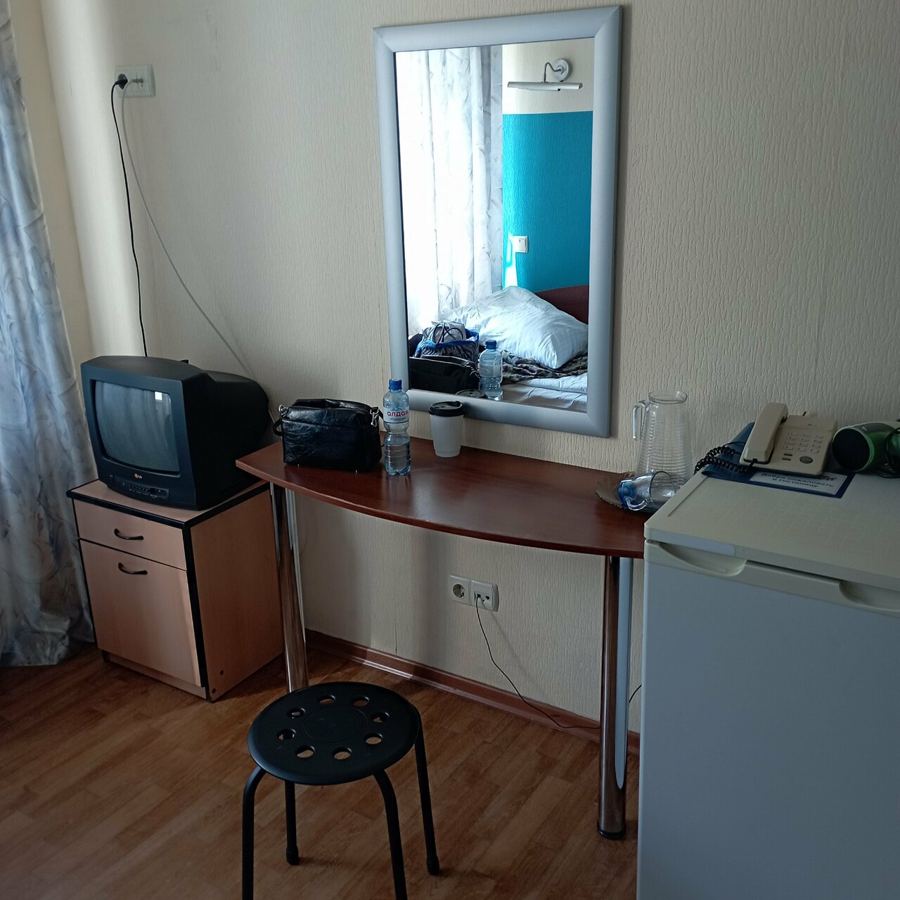 Чистый номер (номер на двоих в рабочей поездке) Розеток у кроватей нет, вообще розеток две, одна на холодильник, вторая на телевизор, так что прийдётся выбирать. Телевизор маленький ламповый, но цветной и каналы без помех. Пляж рядом, недалеко пятёрка 24 часа, вайфай дубовый