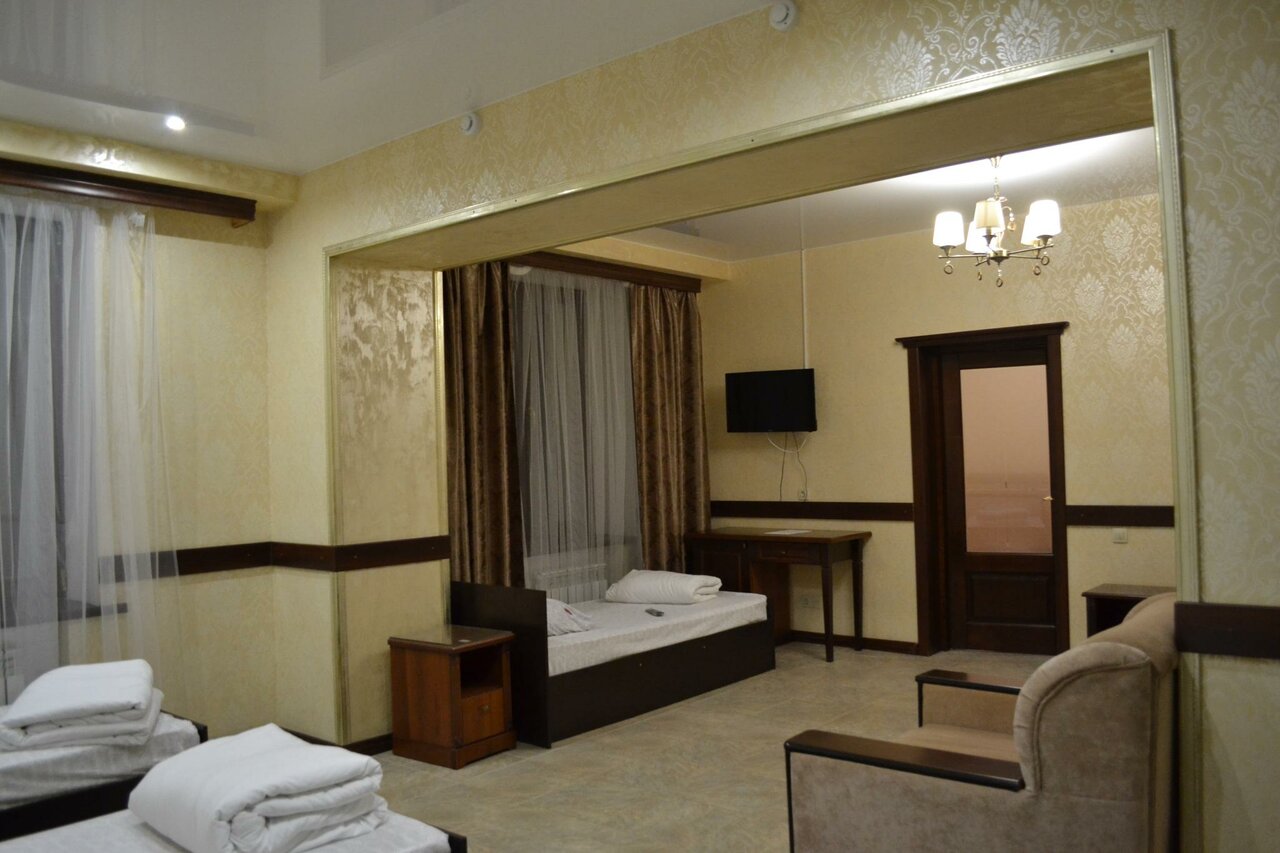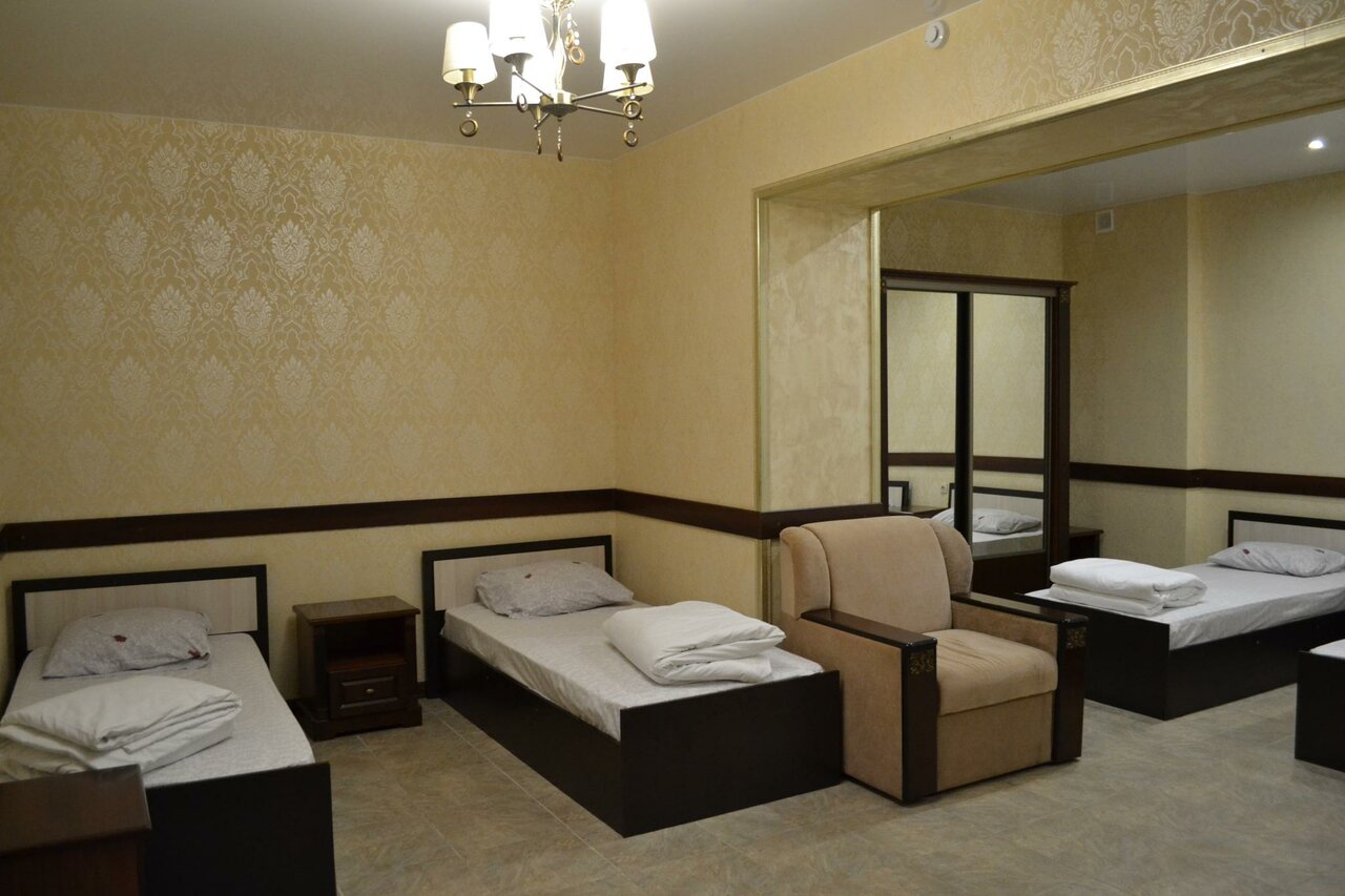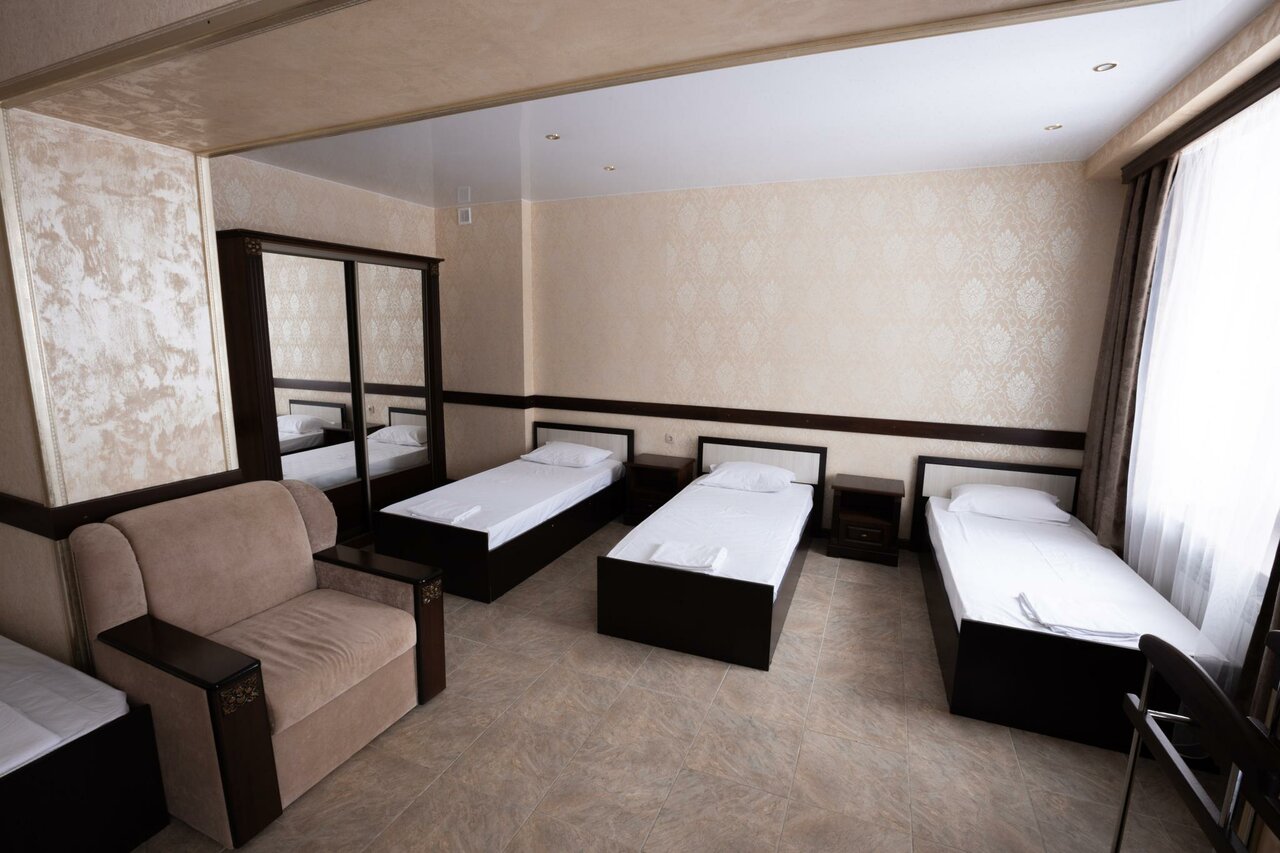 Комфортабельный номер с 4 полуторными кроватями,прикроватными тумбочками,шкафом-купе для одежды с вешалками,телевизор ЖК, холодильник,душевой комнатой и санузлом.В номере и на всей территории отеля бесплатный Wi-Fi.