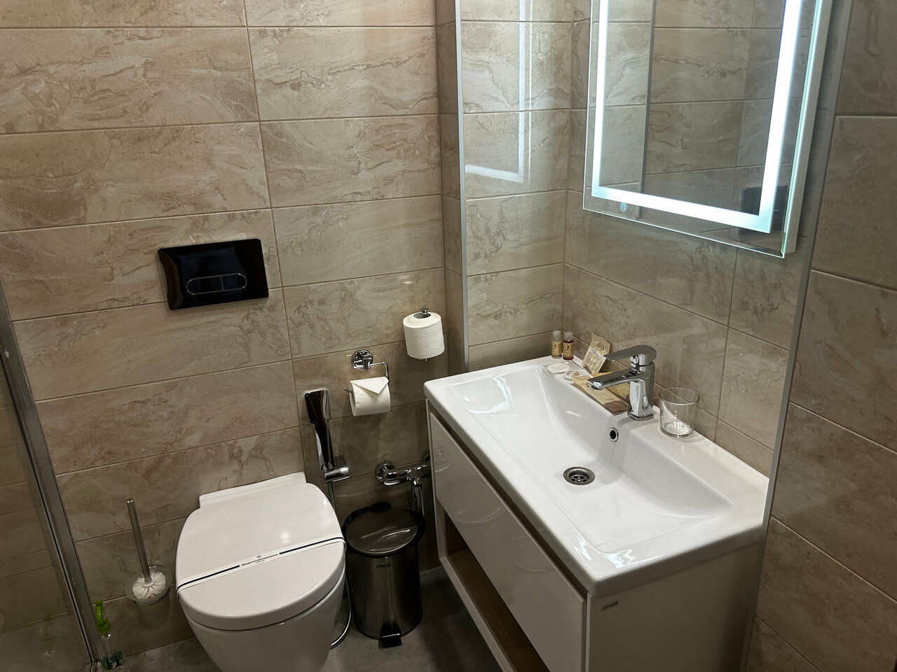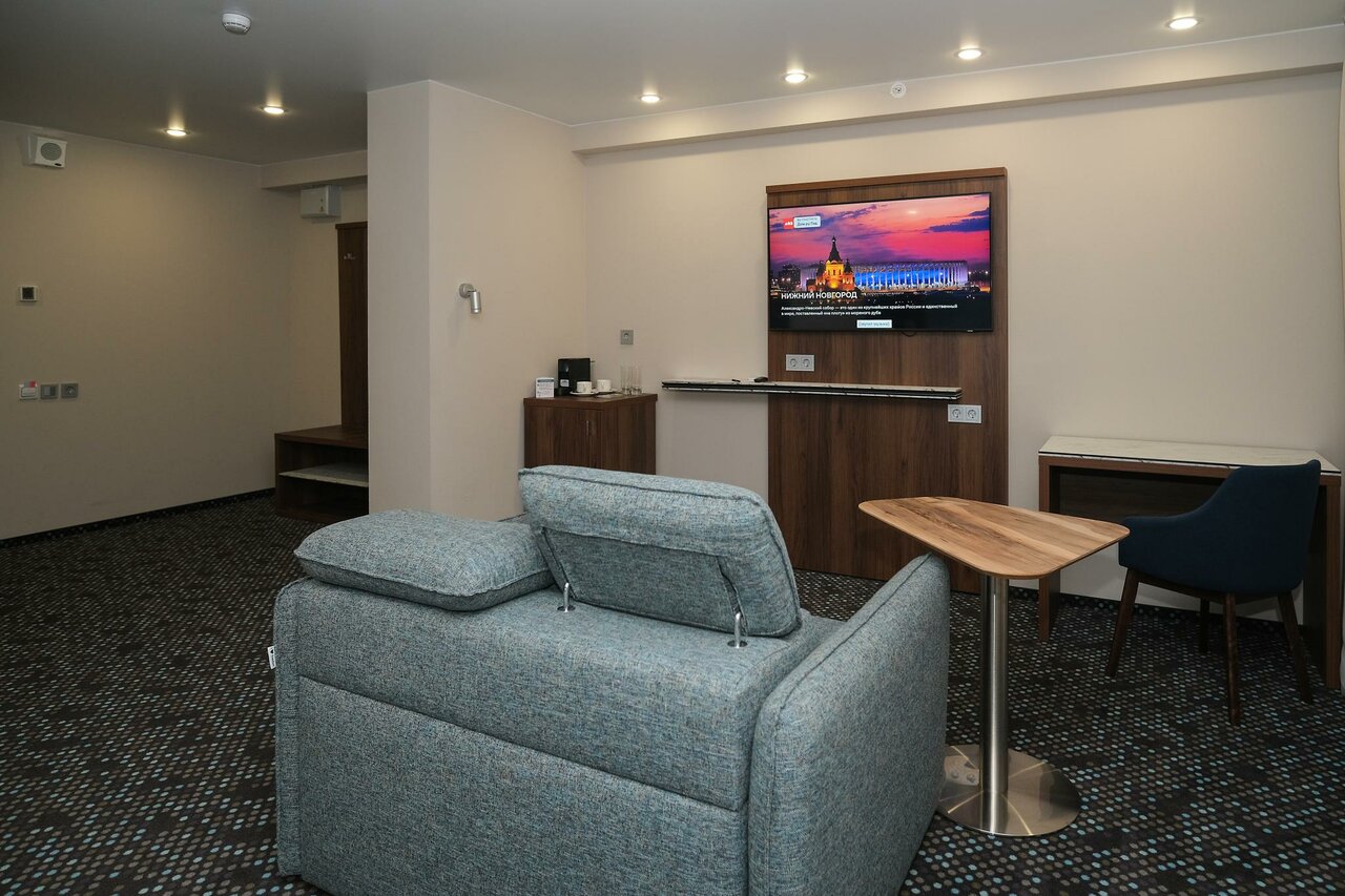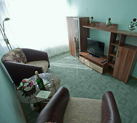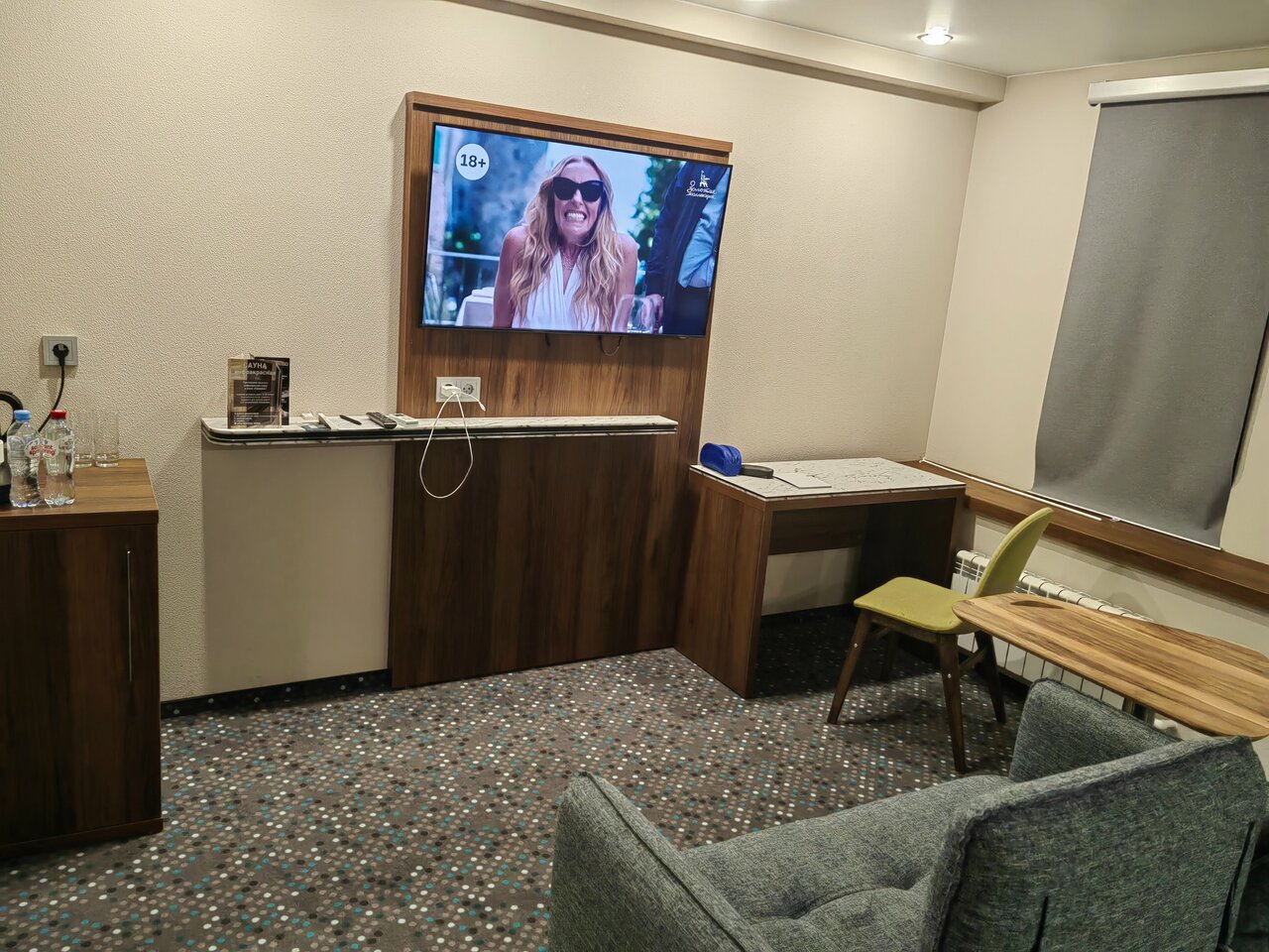 Номер хороший. Мебель, чистота, сантехника — всё отлично. Но: Кондиционер не работает. Горячая вода в душе нагрелась через 10 минут после открытия воды. А самый главный минус — это шум от автодороги за окном — ОООчень громко, спать невозможно. И что это за люкс на втором этаже? Сделали бы прям на ресепшн.