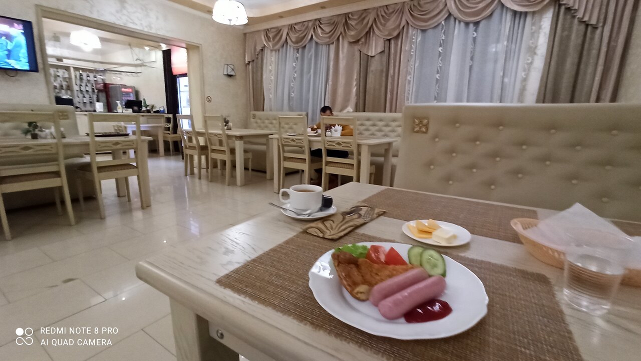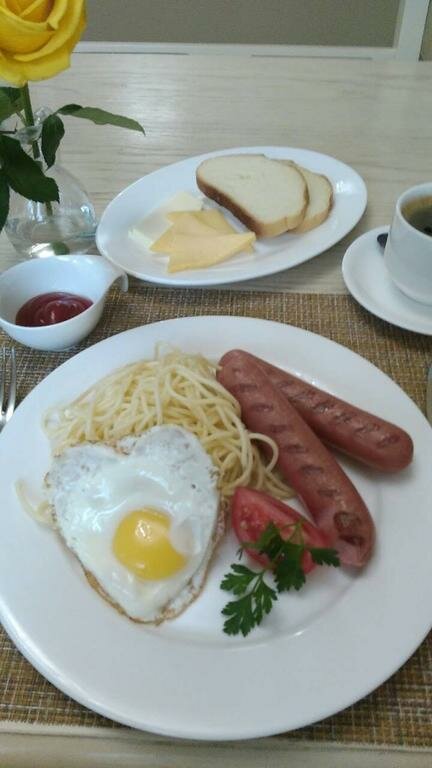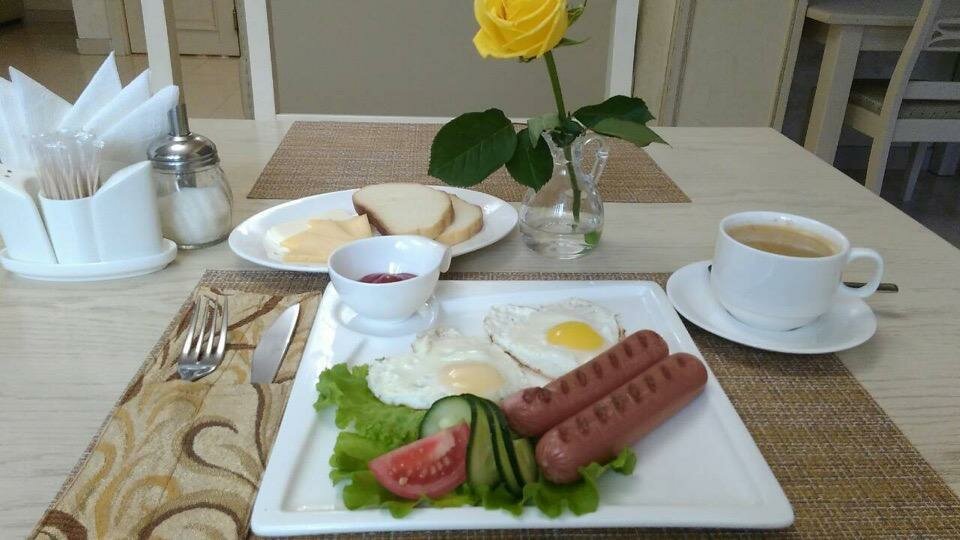 Гостиница неплохая. номера небольшие. Шкафа нет. Есть фен, холодильник, телевизор и чайник с чашками, но чая нет, зубных наборов тоже нет, как и тапочек. В номере чисто. Самое важное для меня было наличие кондиционера и утюга. Завтрак по меню входит в стоимость проживания, т.е. надо выбрать из 5 вариантов меню тот, что Вам подходит. Голодной не осталась. На прилегающей территории имеется небольшая парковка.Обслуживание вежливое, приветливое. Само расположение гостиницы очень удобное
