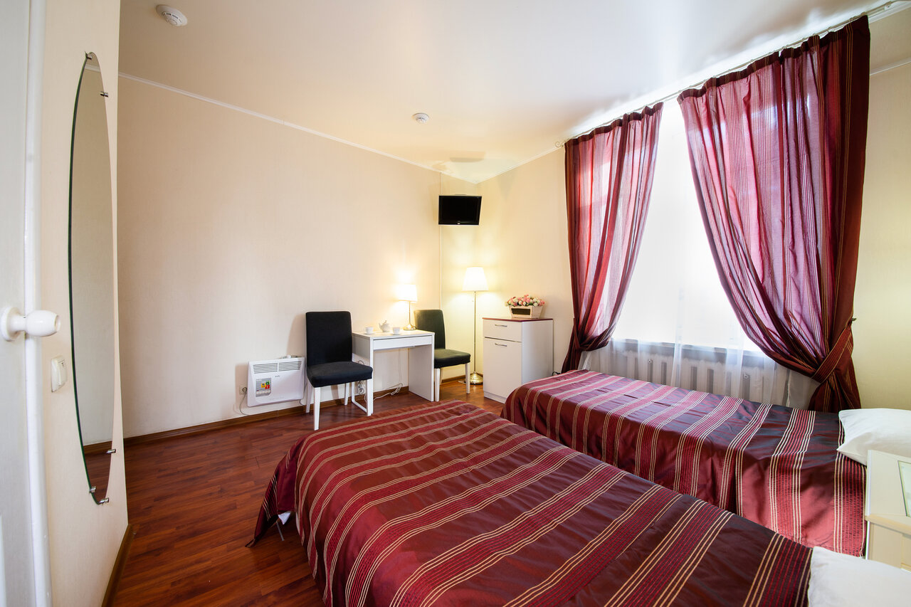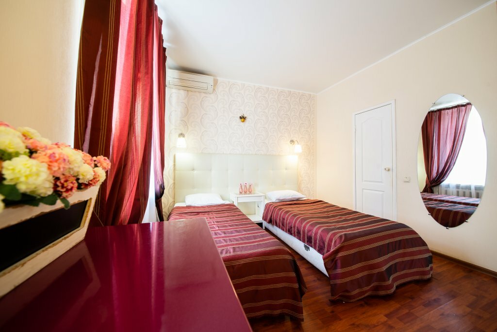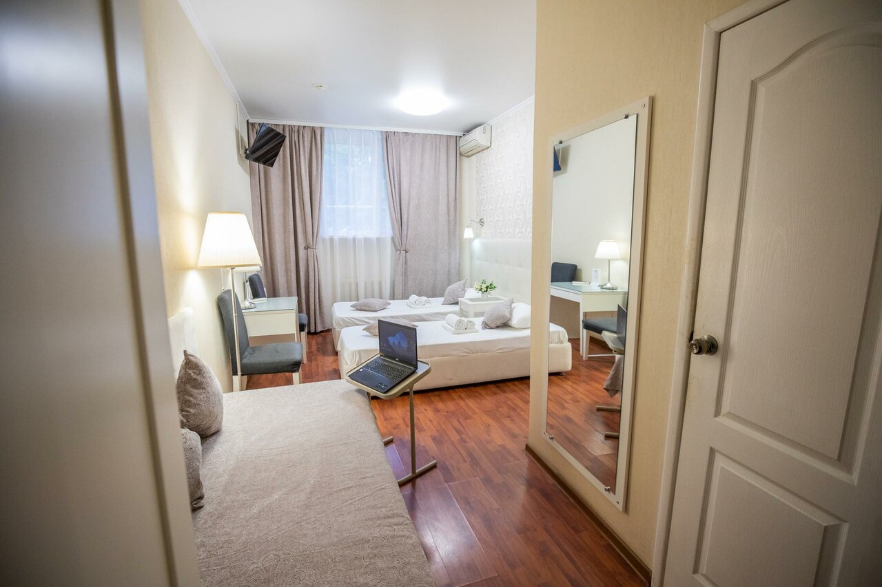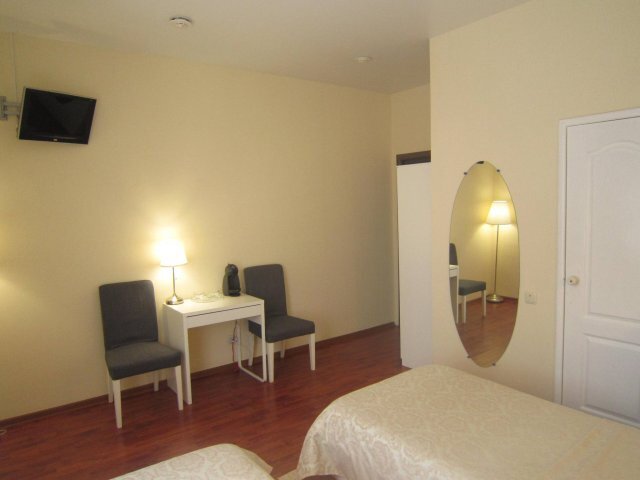 Хороший, небольшой отель, расположенный в пяти минутах ходьбы от ж/д и автовокзала! Еще в десяти минутах хотьбы от него есть большой ТЦ Триумф. Персонал вежливый. В номере чисто, аккуратно, убирали каждый день, вешали новые полотенца. Брала только завтраки, нужно заказывать с вечера, на удобное вам время, а утром его приносят в номер. В меню яичница с сосисками и овощами или молочная каша или блинчики, йогурт, сыр, чай, кофе. Номер небольшой (был 3-х местный, брали на двоих) для трех человек будет тесноват. В номере кровать и диван, два кресла, платяной шкаф с вешалками и телевизор. Есть холодильник, чайник со стаканами, мыльные принадлежности (шампунь, гель для душа), тапочки. Если на пару дней, то подходит прекрасно!