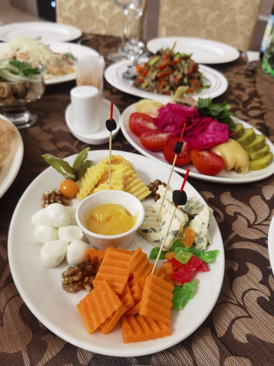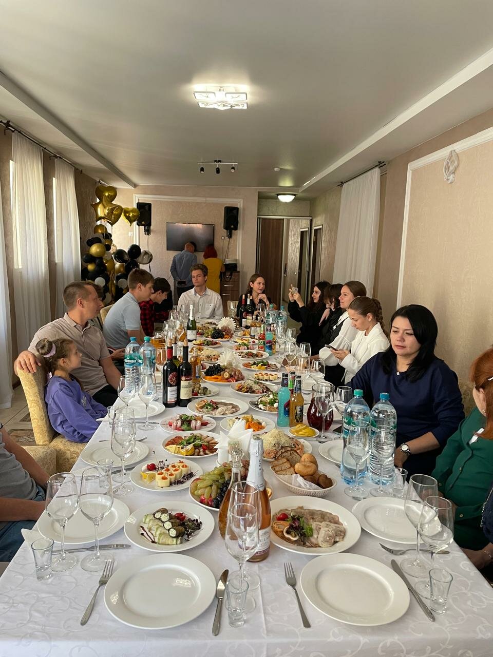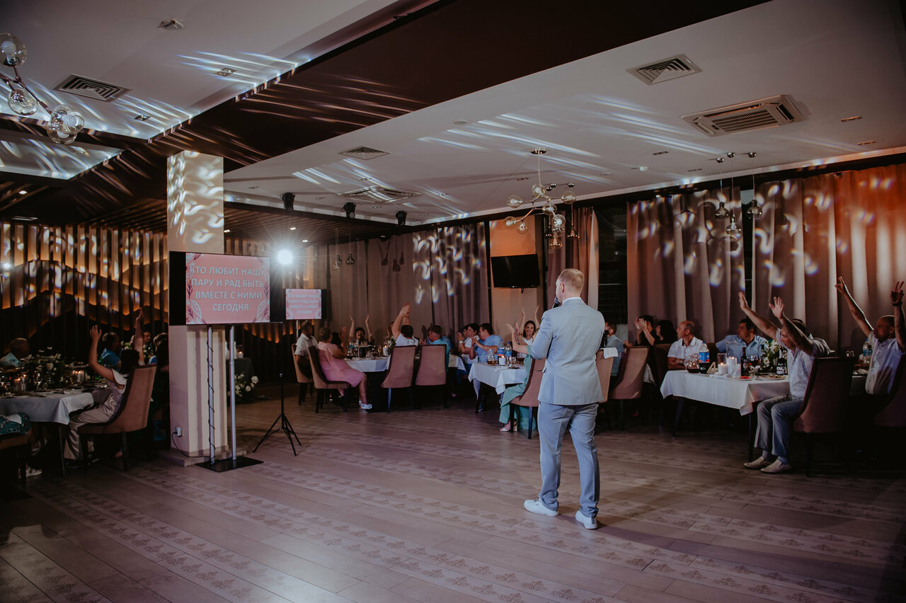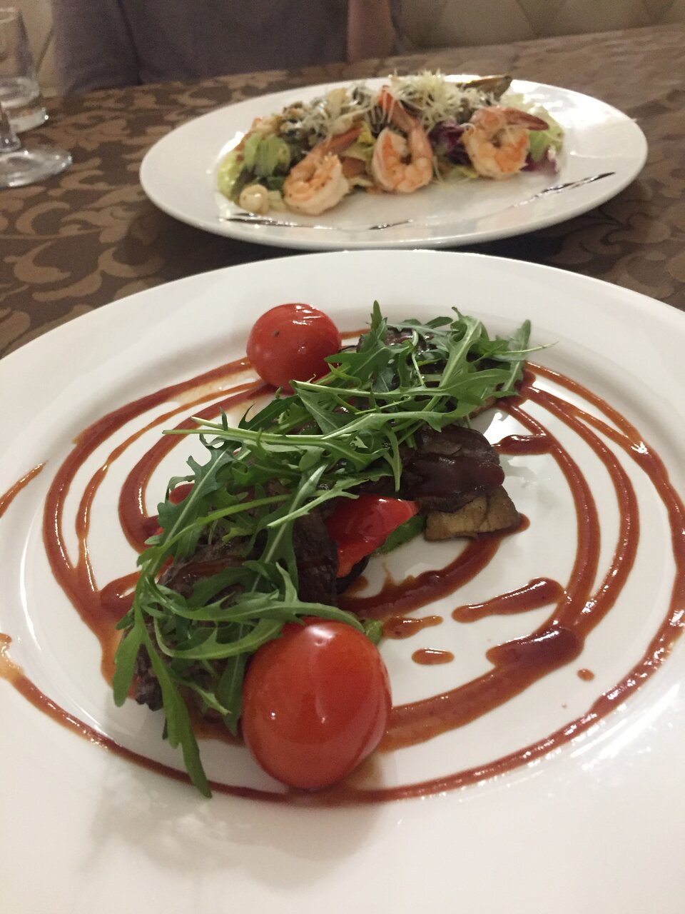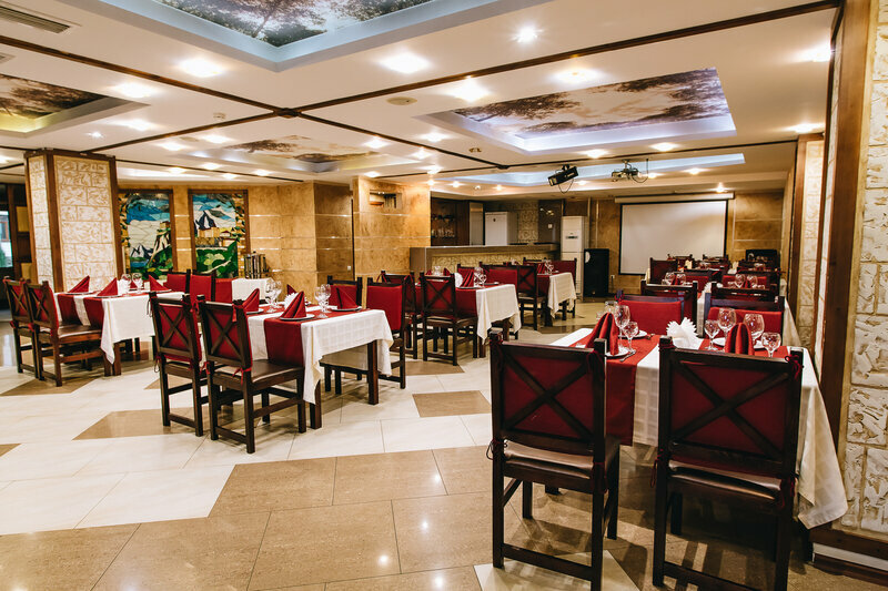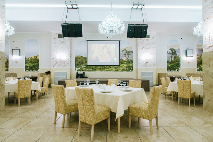 Достойный для ужина банкетный зал, и гостевые места и рассположение муз. колонок (под и над сценой). Столы для больших компаний накрытые дорогими скатертями. Интересное решение — банкетный зал находится под отелем, то есть такое расположение предохранет от громких звуков других гостей. Я завтракал в этом зале (командировка) для завтраков столы конечно шикарные. Единственный пожалуй минус — обслуживающий персонал справляется со своими обязанностями, но если б ещё хоть иногда выпускал телефон из рук было бы ещё лучше. Не нужно излишнего внимания, но всё же приятнее общаться с человеком который смотрит тебе в глаза, а не в экран своего гаджета не понимая чего ты пытаешься донести до собеседника.