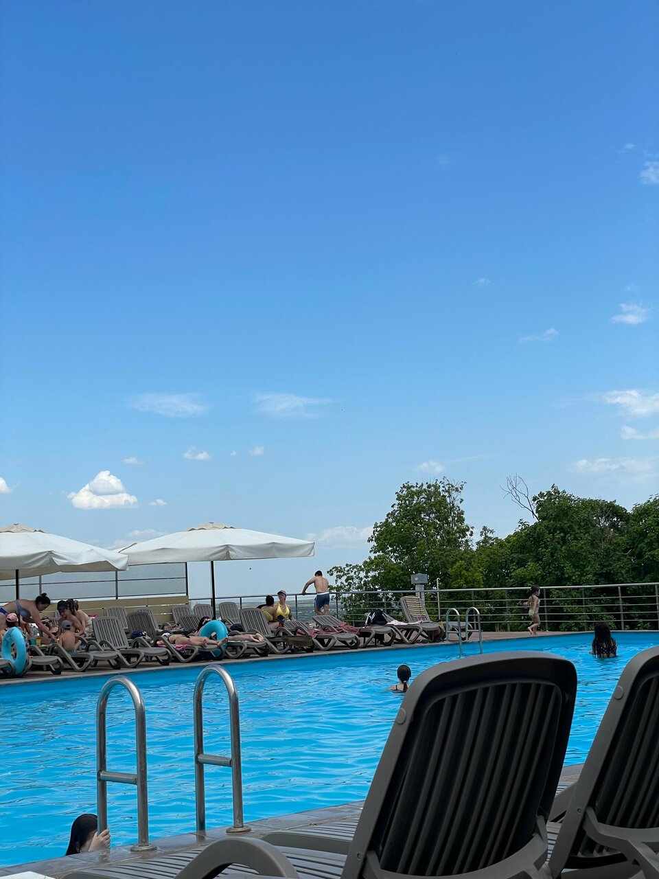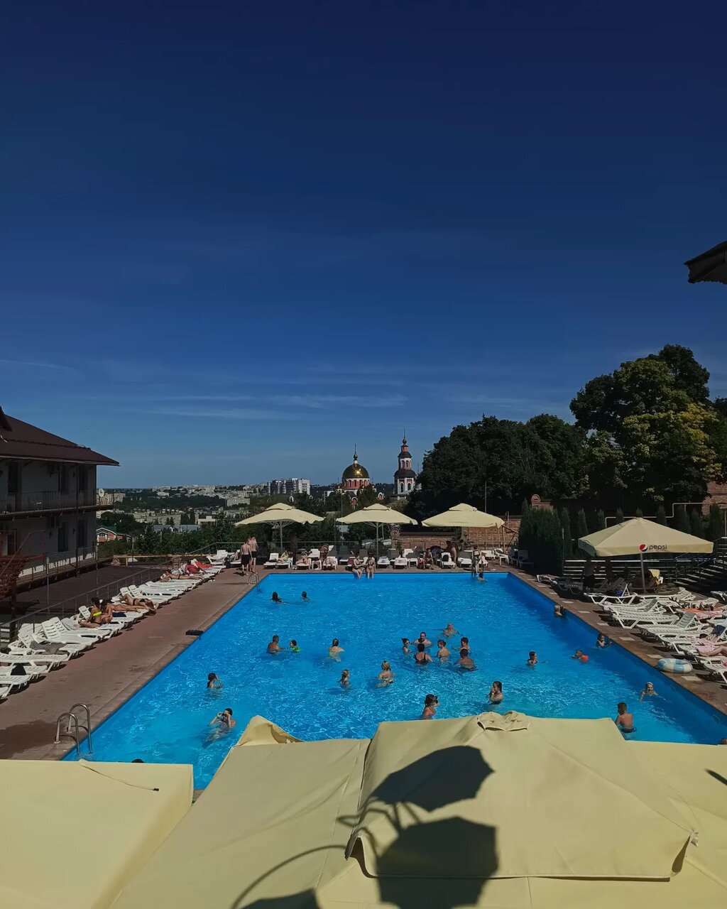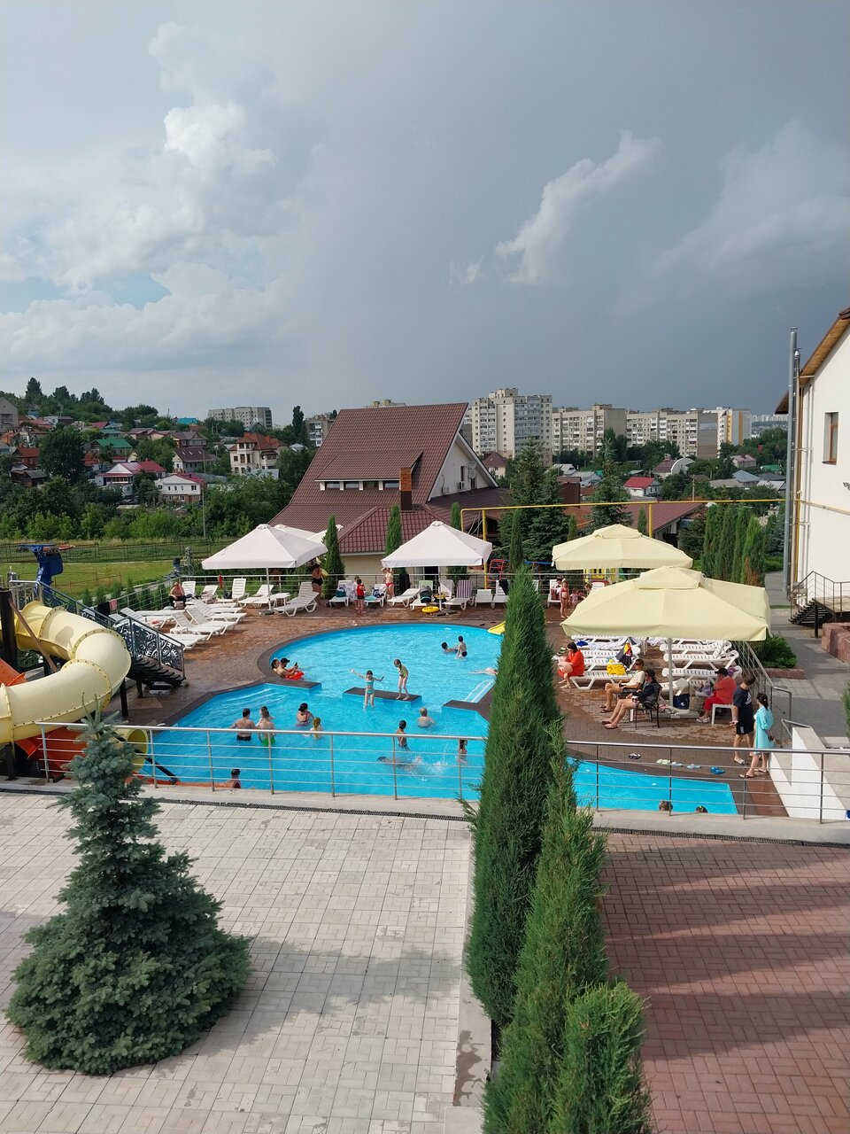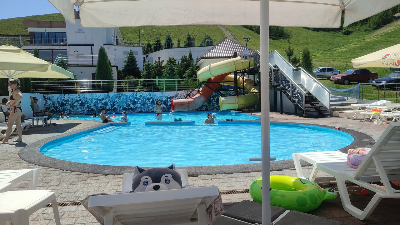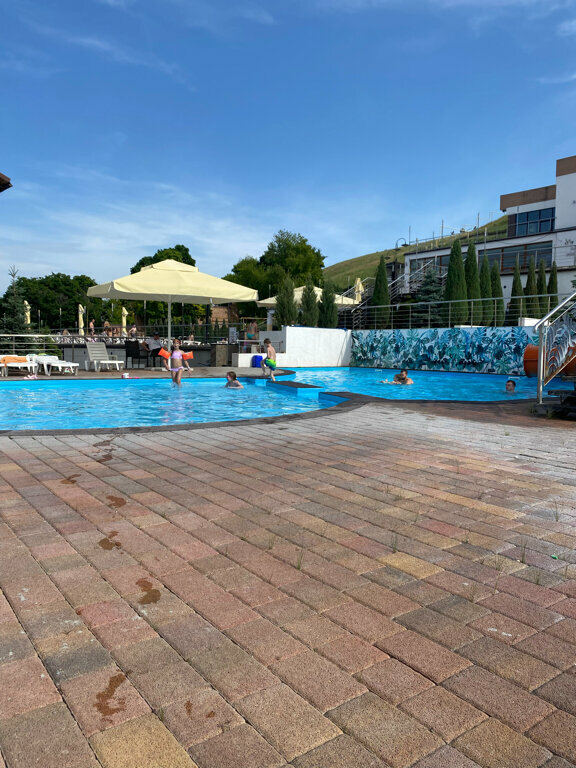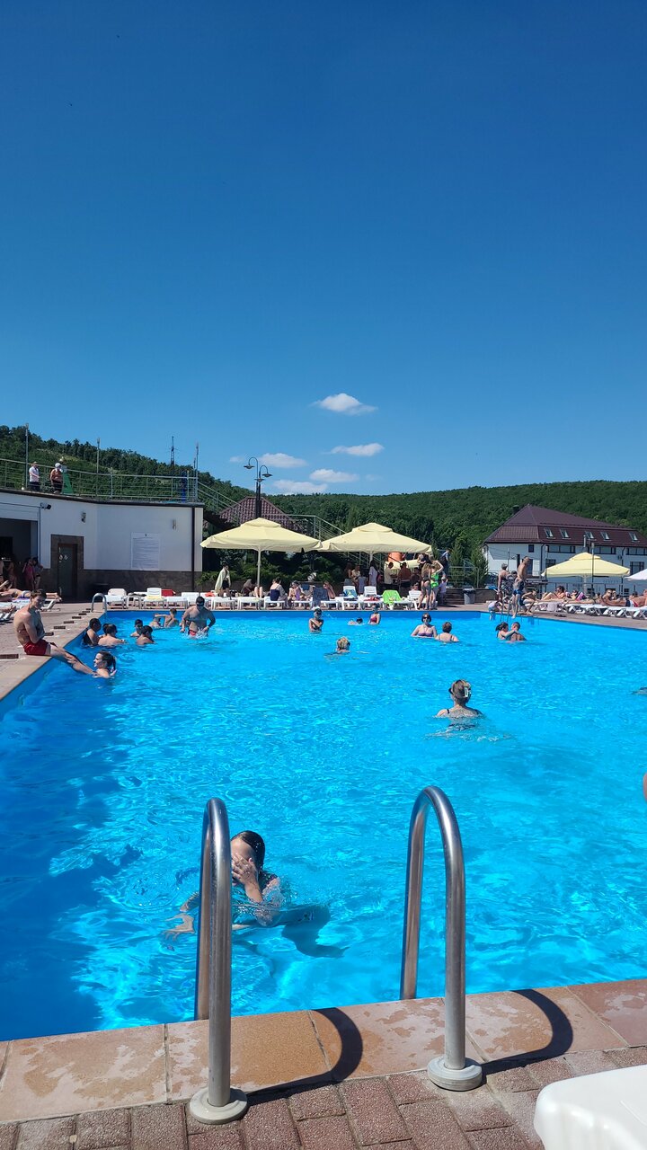 На территории парк-отеля ‘Вишневая гора’ располагается 3 бассейна: 2 больших ‘взрослых’ и 1 детский. Бассейны чистые, постоянно ходят сотрудники, которые проверяют чистоту, вылавливают насекомых, если те попадают в воду. Из плюсов близко расположенный бар, есть снеки, пицца, шаурма, мороженное. Можно заказать кальян. Большое количество шезлонгов. В детском бассейне горки, от которых дети, очевидно, в восторге. Из минусов: очень печальная женская раздевалка со сломанной дверью в туалет. Из-за удобного расположения (в черте города) очень много людей (включая меня) и это утром в будний день. 2/3 лежаков были заняты. Если вы с детьми, то им точно понравится, вот остальным взрослым без детей не факт, т.к. все они весело прыгают бассейн.