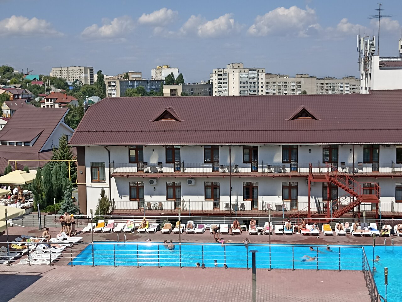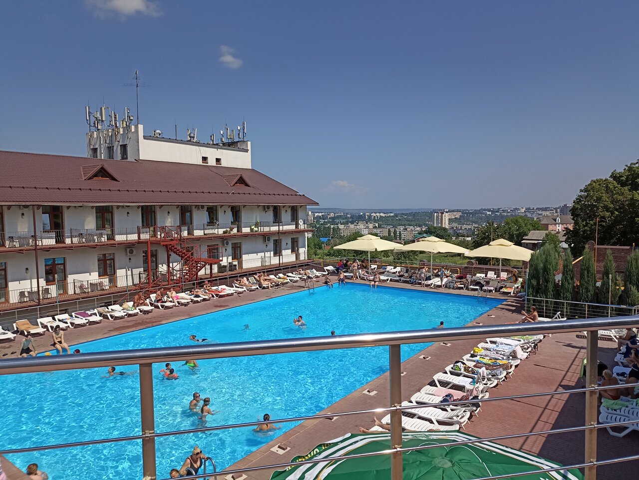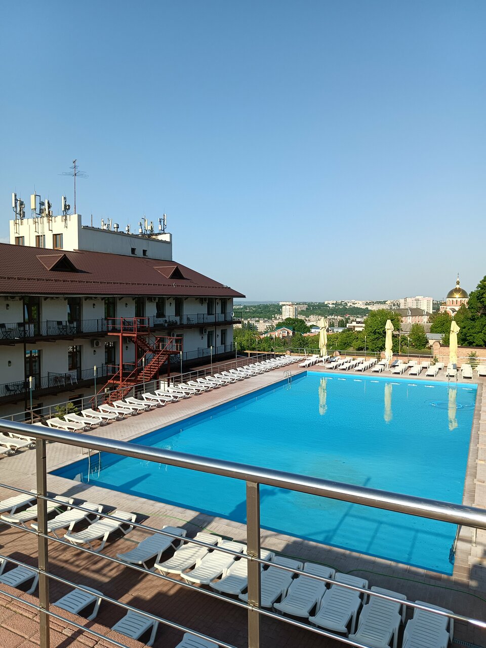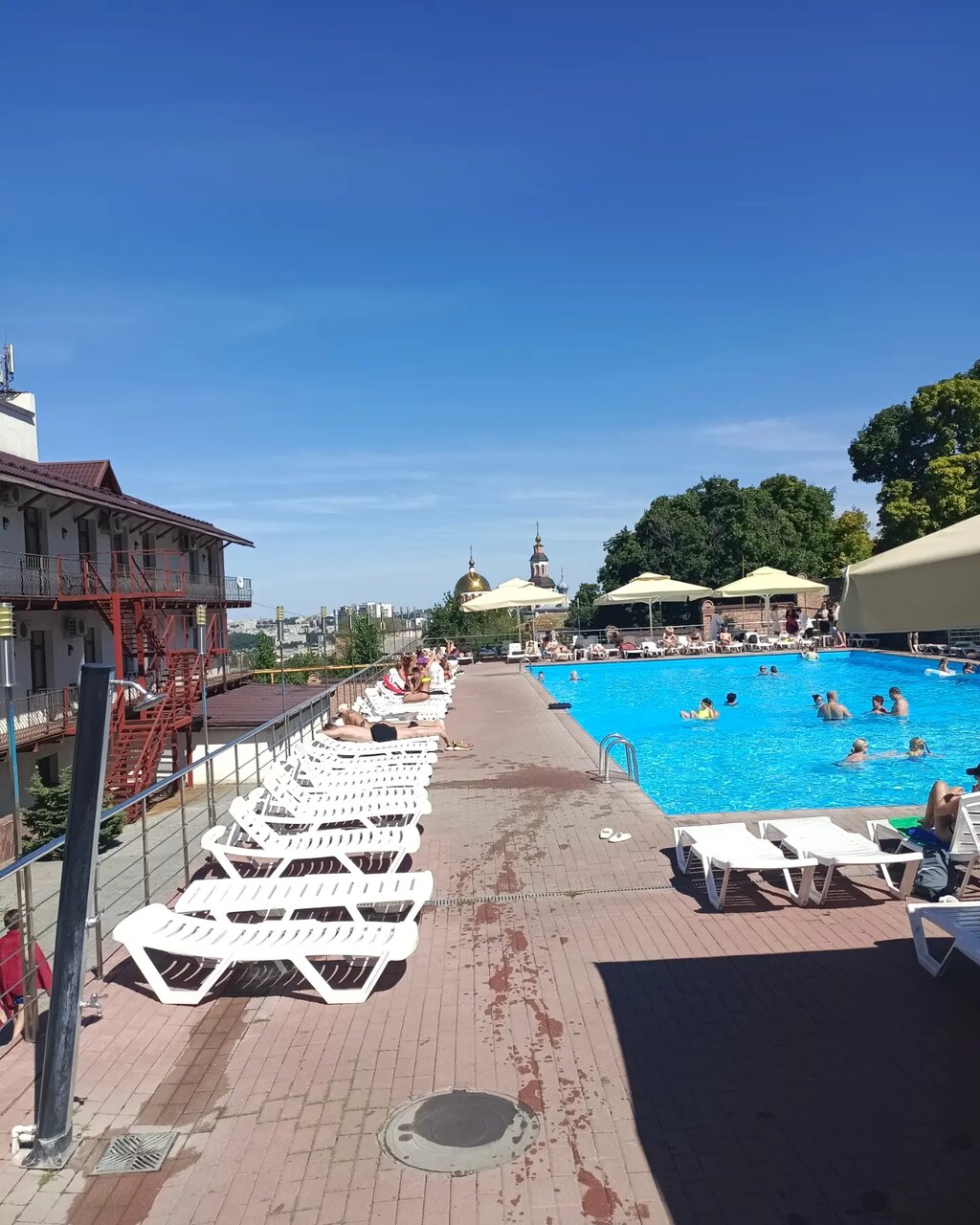 На территории парк-отеля ‘Вишневая гора’ располагается 3 бассейна: 2 больших ‘взрослых’ и 1 детский. Бассейны чистые, постоянно ходят сотрудники, которые проверяют чистоту, вылавливают насекомых, если те попадают в воду. Из плюсов близко расположенный бар, есть снеки, пицца, шаурма, мороженное. Можно заказать кальян. Большое количество шезлонгов. В детском бассейне горки, от которых дети, очевидно, в восторге. Из минусов: очень печальная женская раздевалка со сломанной дверью в туалет. Из-за удобного расположения (в черте города) очень много людей (включая меня) и это утром в будний день. 2/3 лежаков были заняты. Если вы с детьми, то им точно понравится, вот остальным взрослым без детей не факт, т.к. все они весело прыгают бассейн.