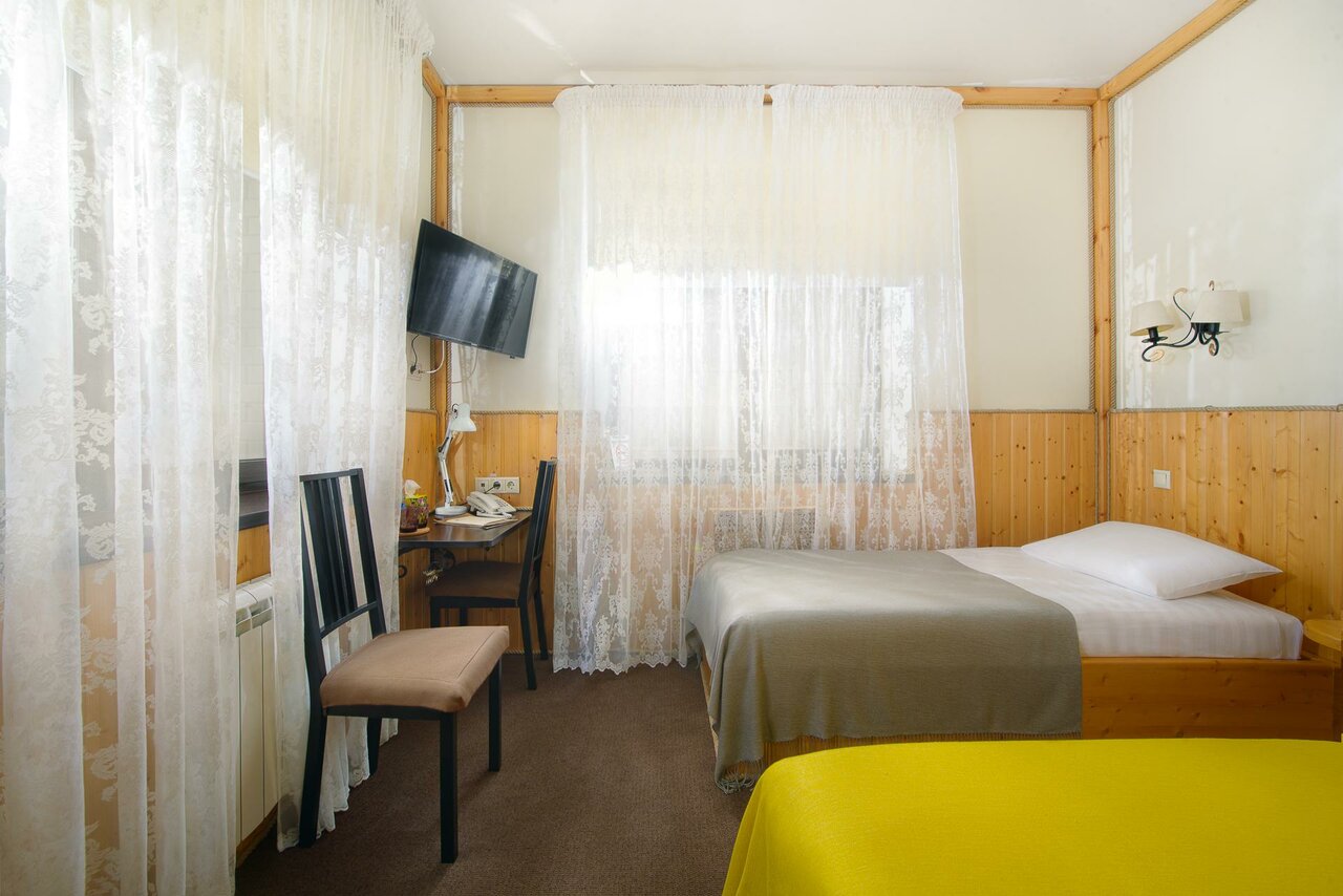 Услуги: — Номера (от 3500 до 6500 ₽/ночь) с кондиционером, Wi-Fi, телевизором, холодильником, феном. — Питание: завтрак (по меню), полупансион, полный пансион или опция без питания. — Ресторан, кафе, бар, банкетный зал, конференц-зал. — Сауна, баня, бесплатная парковка (включая услуги парковщика). — Дополнительно: прачечная, сейф, чайник, микроволновка, уборка, консьерж-сервис.