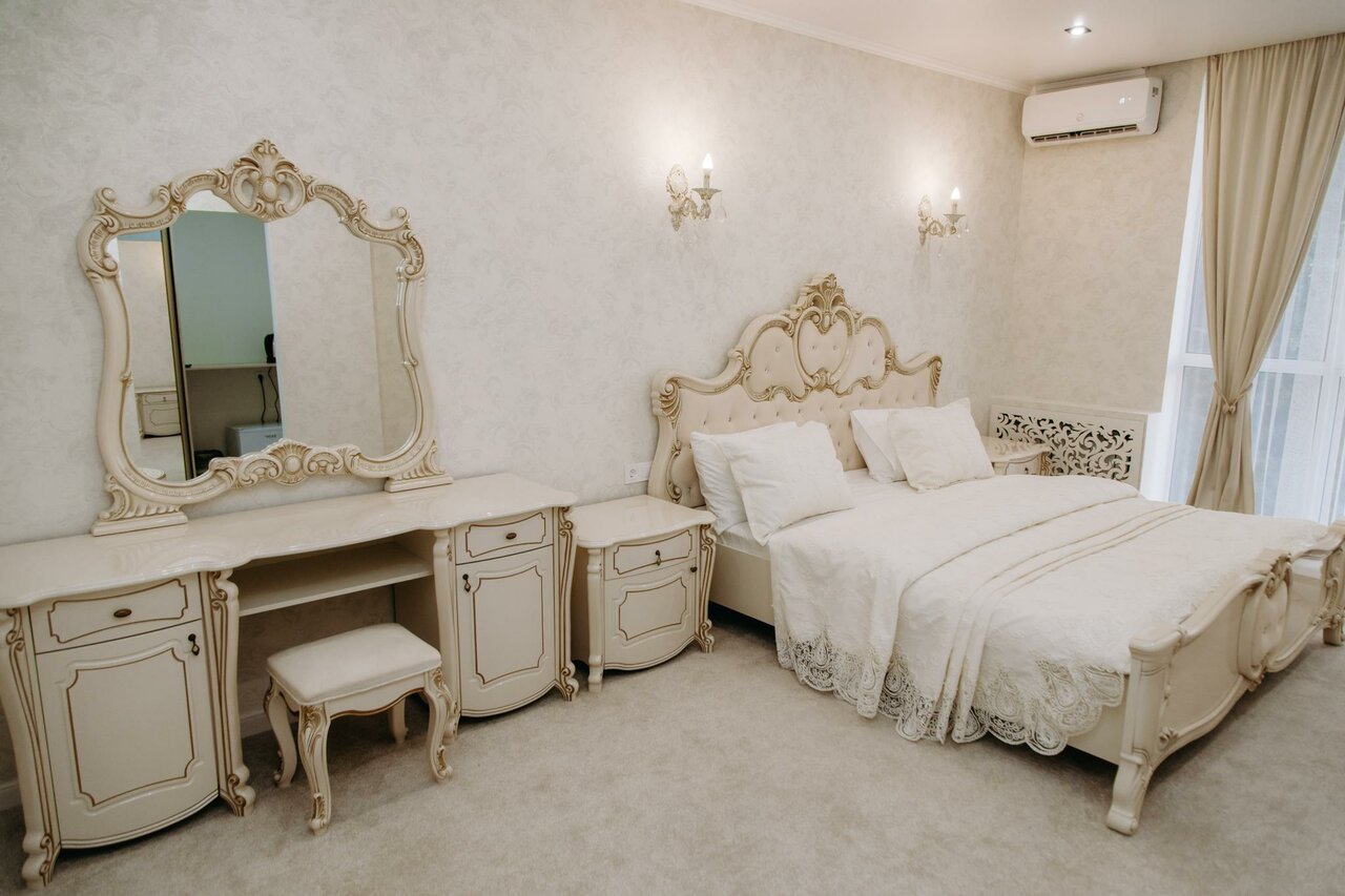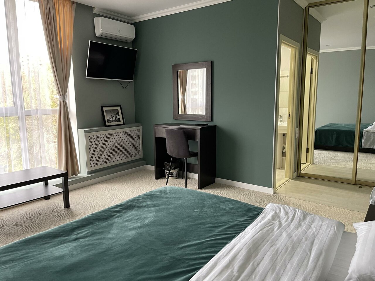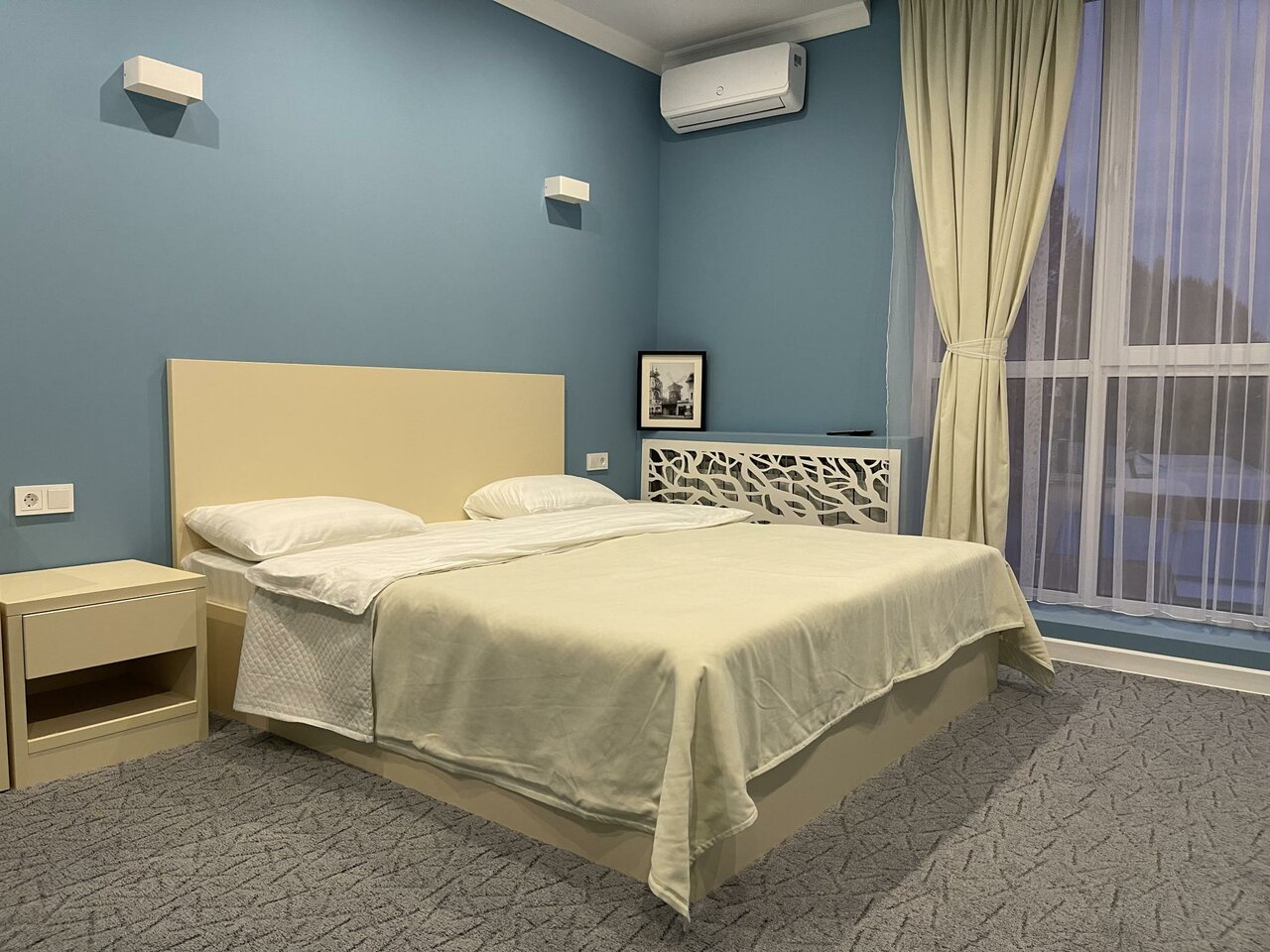 Номер категории Люкс с удобной мебелью и собственным балконом.Есть вся необходимая мебель для комфортного проживания.В номере: двуспальная кровать, прикроватная тумба, журнальный столик, вешалка для одежды, санузел с душевой кабиной, телевизор...