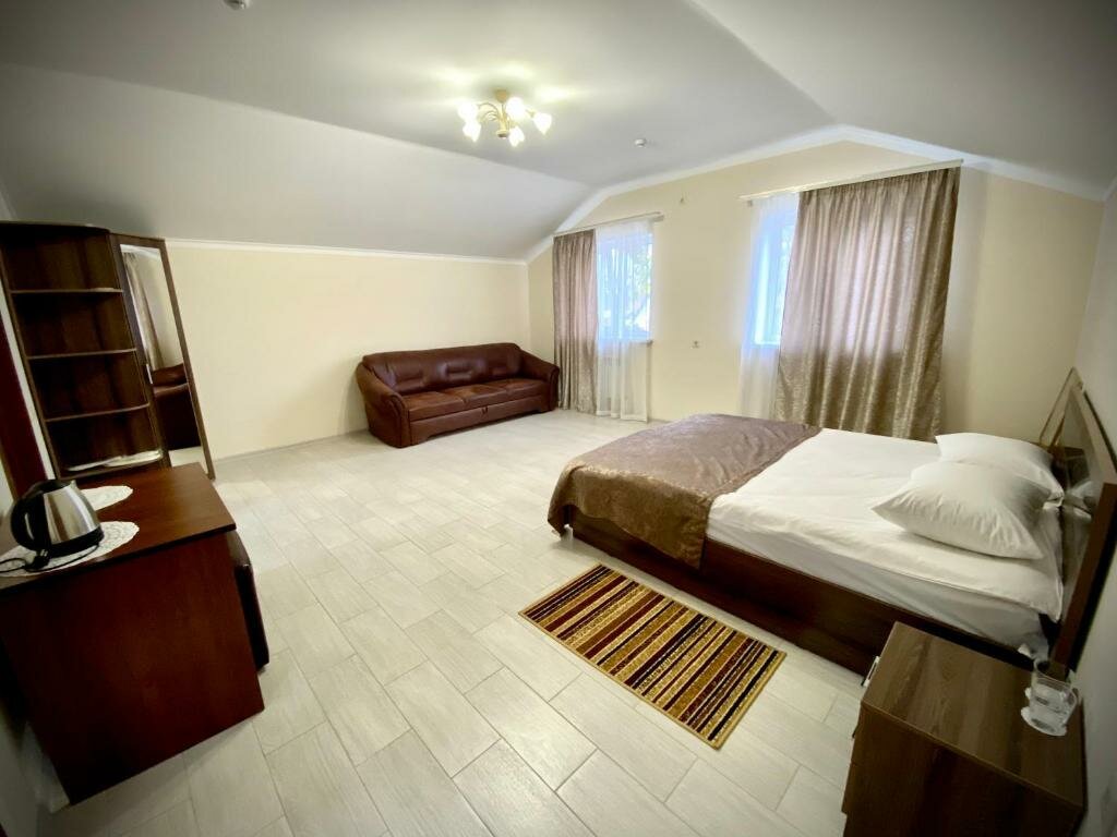 Комфортный номер. С диваном и двуспальной кроватью. Светлый интерьер. Телевизор.