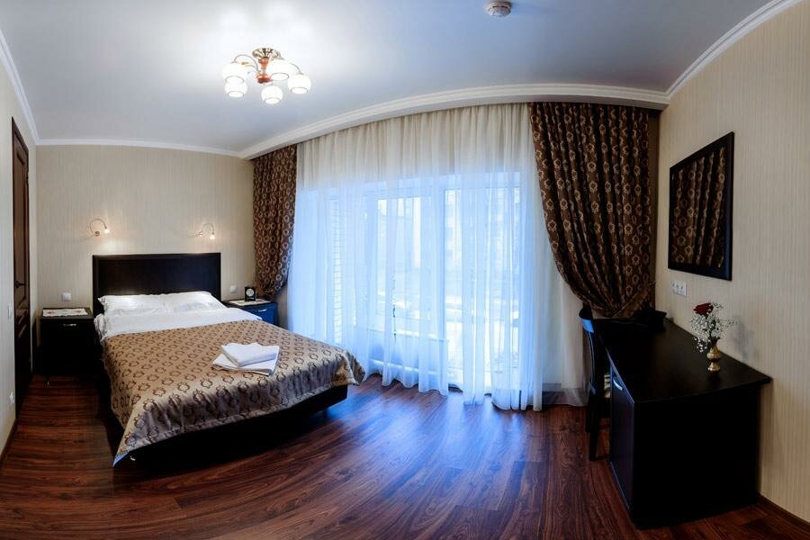 Номер категории 'Де Люкс' 41 кв м с двуспальной кроватью и диваном. В номере есть холодильник, телевизор с кабельным TV, WI-FIЗавтрак шведский стол.
