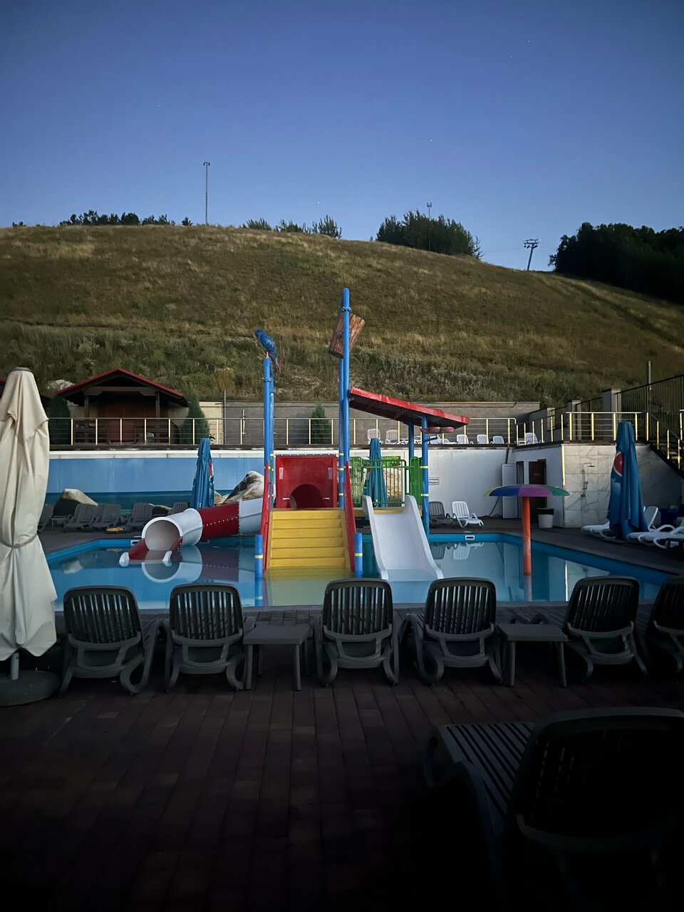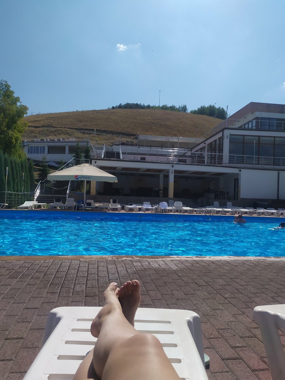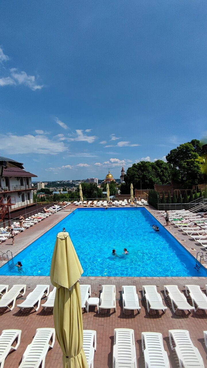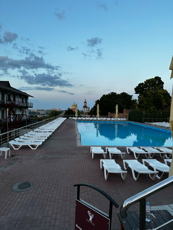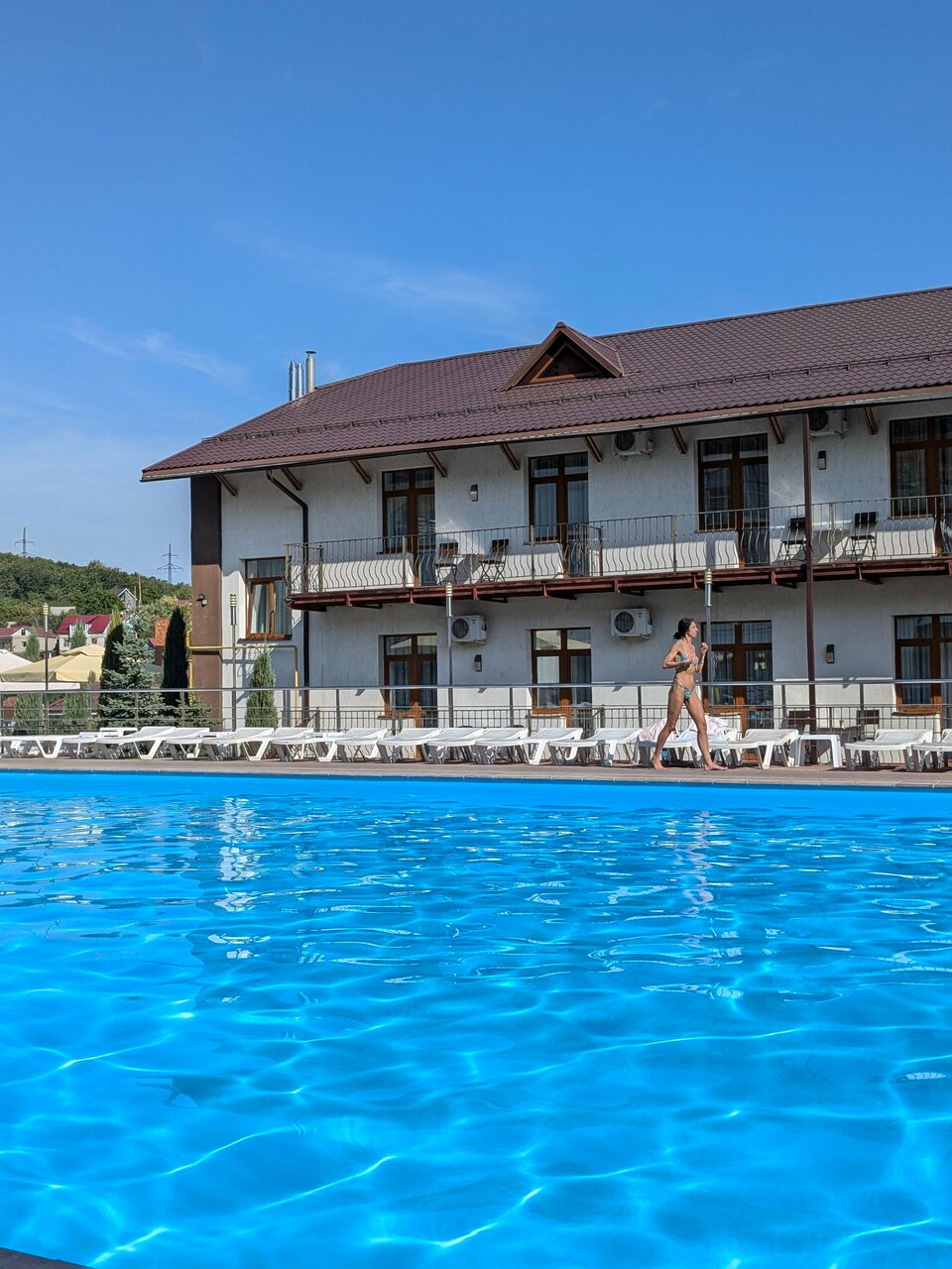 Приходил в этот комплекс в надежде увидеть красивый пейзаж попивая коктейль сидя в бассейне. Пейзаж оказался так себе. Вокруг идёт стройка. Склады тротуарной плитки, трактора и прочие строительные принадлежности, хорошо просматриваются из бассейна. Взглянув выше мы видим зелёные холмы в пастбищами коров пасущимися рядом. Из-за близости леса, в бассейне плавает множество мошек и мух. Персонал пытается справляться с этим, вылавливая живность сочком. Хочу отметить доброжелательность персонала. Ну а в завершении всего пейзажа — это банер на стене рядом с бассейном. На котором изображено какое-то райское место, типа Мальдивы или Бали. Подобные банеры вышли из моды наверно лет как 20 назад. Сам бассейн небольшой. Из минусов ещё хочется отметить тот факт, что уехать от туда можно только на такси или собственном транспорте.