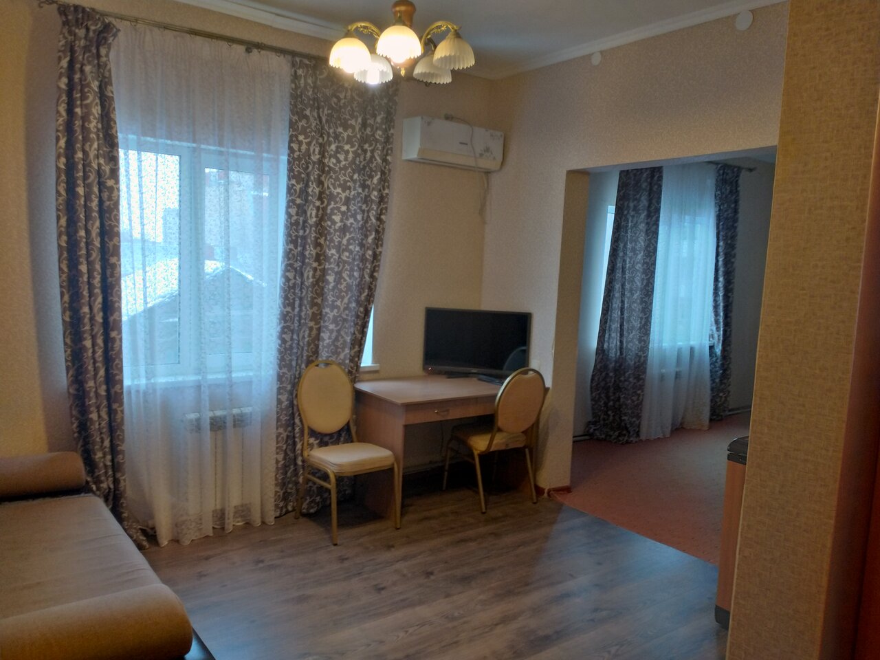 Ночевали здесь одну ночь в мае, когда ехали проездом. Номер был достаточно просторный, но не очень уютный, на мой взгляд. Высокие потолки и голые стены:) Всё необходимое есть — кровать, холодильник, телевизор, стол и стулья, шкаф, санузел За окном во дворе храм, с утра послушали колокольный звон, так что если любите поспать с утра, то будьте готовы 🙂