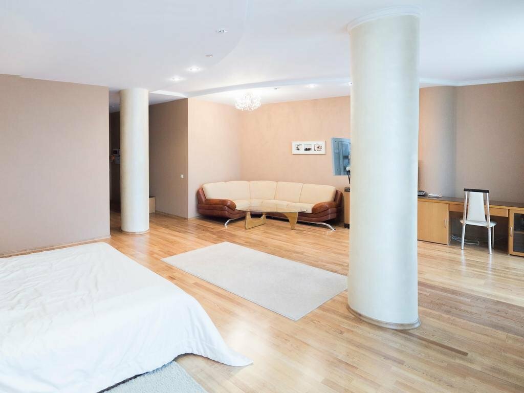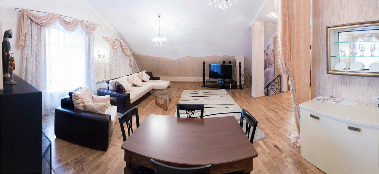 Полукруглый потолок в гостиной, мягкое освещение, домашний кинотеатр и ванная комната в ретро-стиле создают действительно теплую, домашнюю обстановку в номере отеля. В номере предусмотрен лифт и два входа.