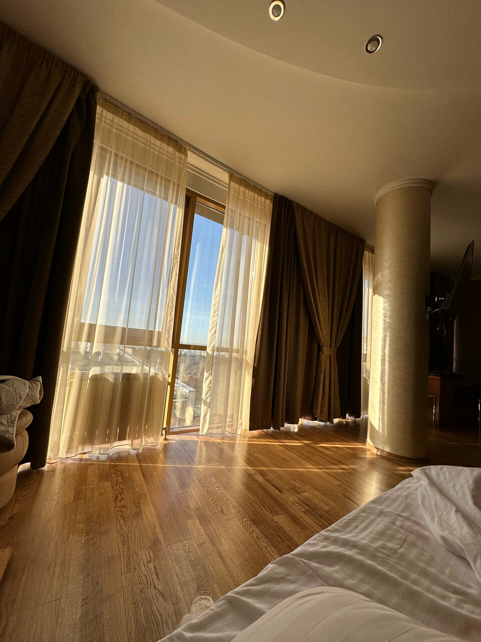 Номера большие, в целом все чисто и аккуратно, но бестолково: розеток у кровати нет, ночников тоже… столы на завтраке очень странные — с полочкой зачем-то, об неё коленку можно разбить. Но альтернативы в городе пока нет(
