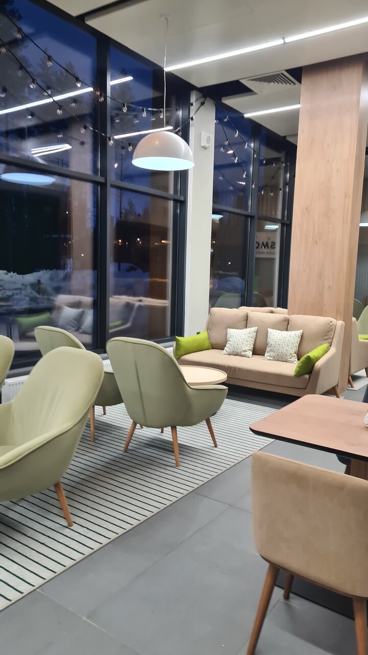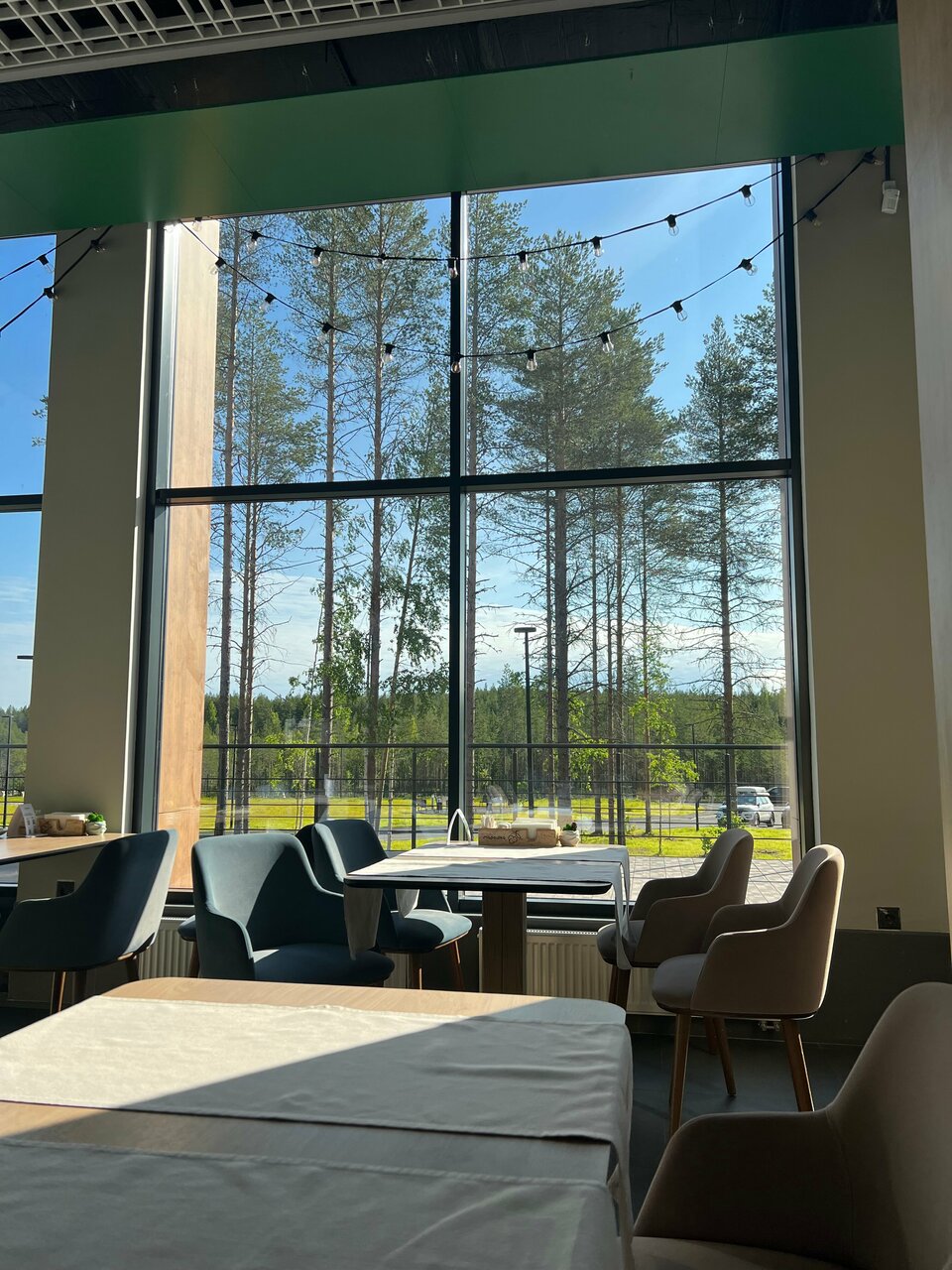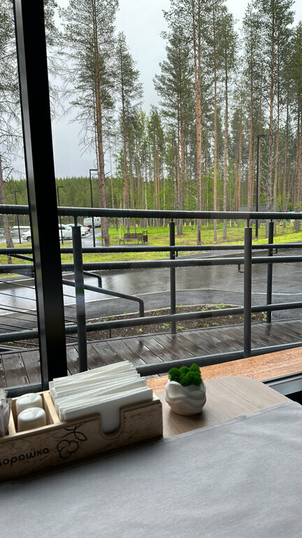 Это то, чего не хватало этому месту! Снимали номер чтоб переночевать по пути СПБ — Мурманск. В номерах чисто, уютно, есть телевизор и вайфай. Завтраки включены в стоимость (есть разные тарифы, мы брали с завтраком) — на завтрак обильный шведский стол. Так же есть обеды и ужины) Вокруг природа, лес — можно отдохнуть от городской суеты.