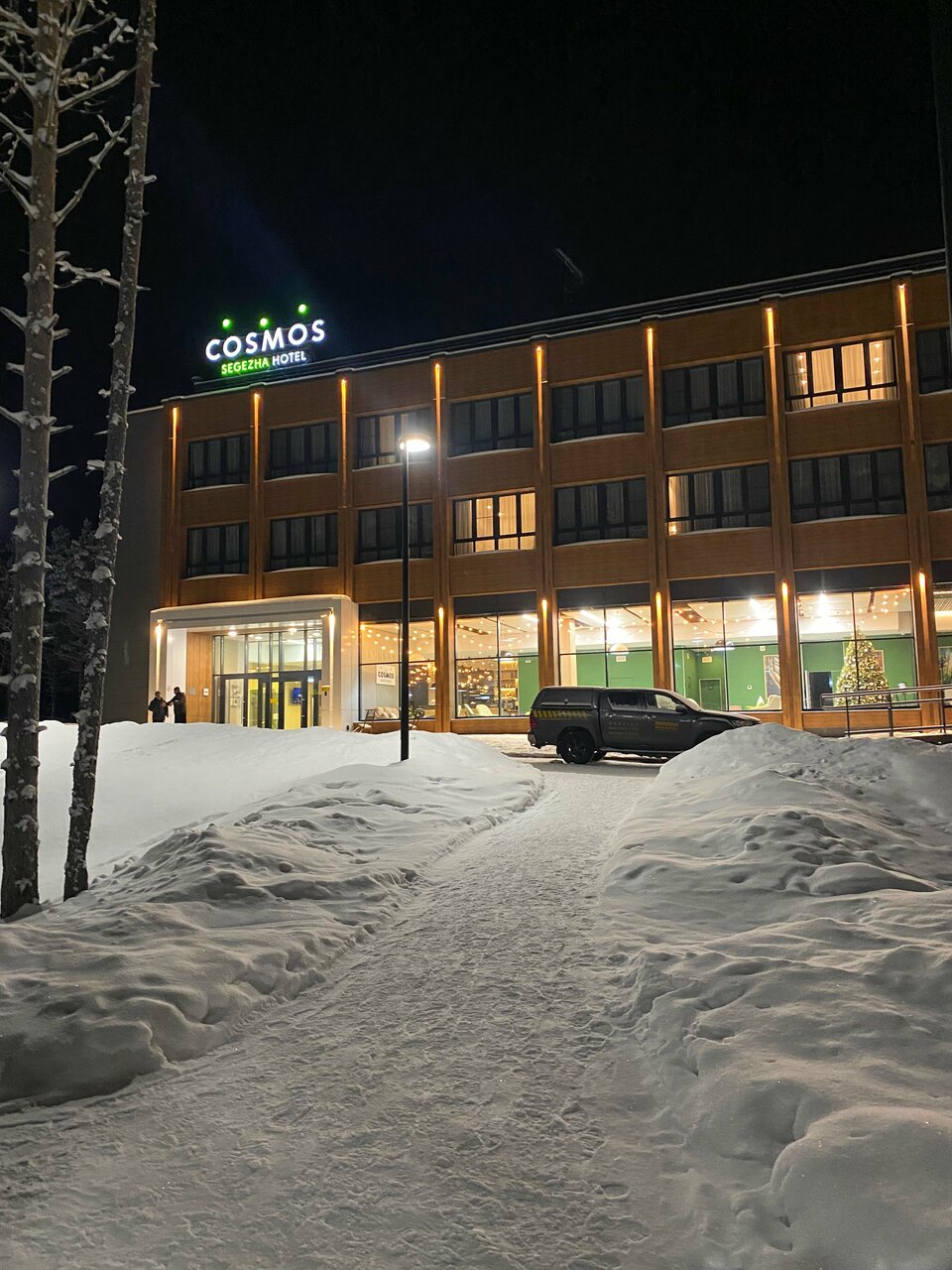 Новая гостиница в Сегеже. Сеть отелей Космос. Отличные интерьеры, новая мебель. Охраняемая территория, большая парковка, лифт. Заезд и выезд по правилам, как везде. Завтрак шведский стол, выбор блюд хороший. Рядом лес, прогулочная зона, озеро. В номере холодильник, чайник, чай, кофе, кружки, большая кровать с матрасом средней жесткости, телевизор. Отличный вай-фай. Находится на не большом удалении от города. В целом, очень благоприятные впечатления.