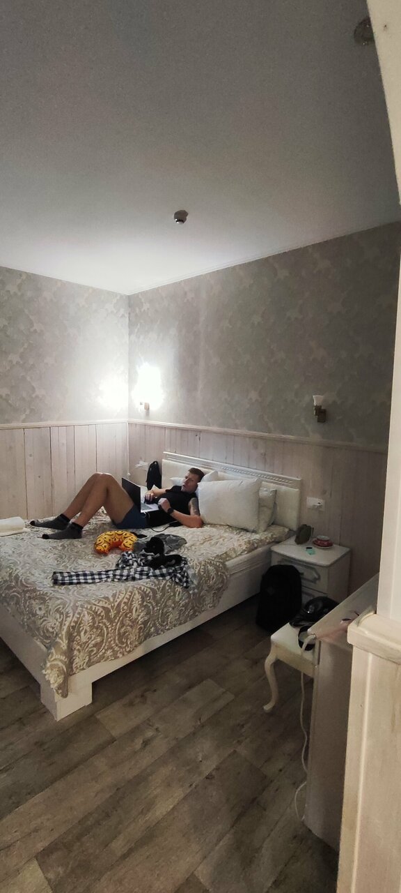 Удалось забронировать номер день в день. Оставался только ‘люкс’ за 4200. По площади просторный, ремонт есть, спальные места: двухспальная кровать (перекошена на бок), диван книжка (сломан раздвижной механизм), телевизор большой (20 каналов, но приставка зависает), в зоне кухни есть капсульная кофеварка, набор посуды на 2-х человек. Номер достаточно холодный, но был конвектор. Звукоизоляция плохая. Кафе не поблизости. Парковки отеля нет. Не стоит своих денег.