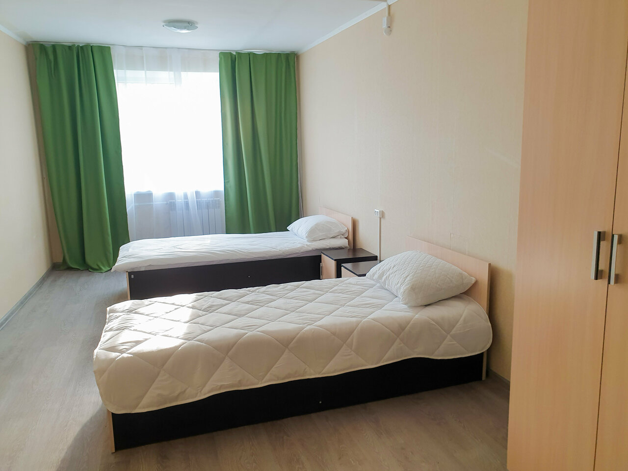Переделанная общага в кубрики по 4 койки. Подушки как бы нет,она есть но настока плоская,что приходится подкладывать вещи по нее,в комнатах холодно,2 маленьких тумбочки и один шкаф на 4 койки место. Живет в гостинице примерно 100 человек,три унитаза,3-4 раковины, ВТОРОЙ сан узел закрыт!((( Но чистота везде.Цена вопроса 2000 рублей
