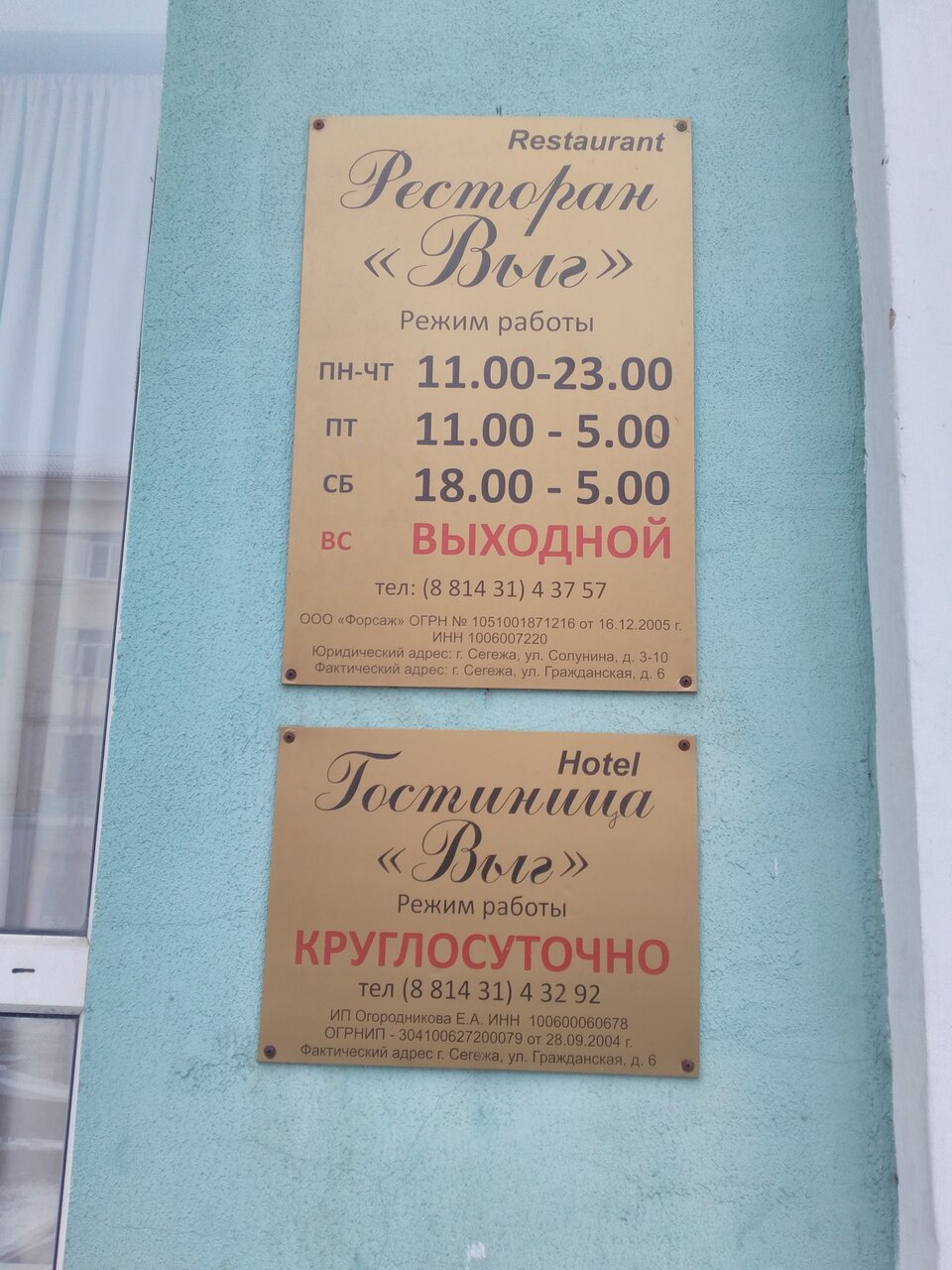 Гостиница «Выг» (Сегежа, ул. Гражданская, 6) — мини-отель категории 3 звезды, работающий круглосуточно. Предлагает номера с телевизором, холодильником, чайником, микроволновкой и бесплатным Wi-Fi. В отеле есть ресторан, кафе, бесплатная парковка и круглосуточная стойка регистрации. Расположен рядом с парком и в пешей доступности от центра (до 5 км). Услуги включают уборку, посуду, чай/кофе в номерах и номера для некурящих. Контакты: +7 (960) 212-01-21.