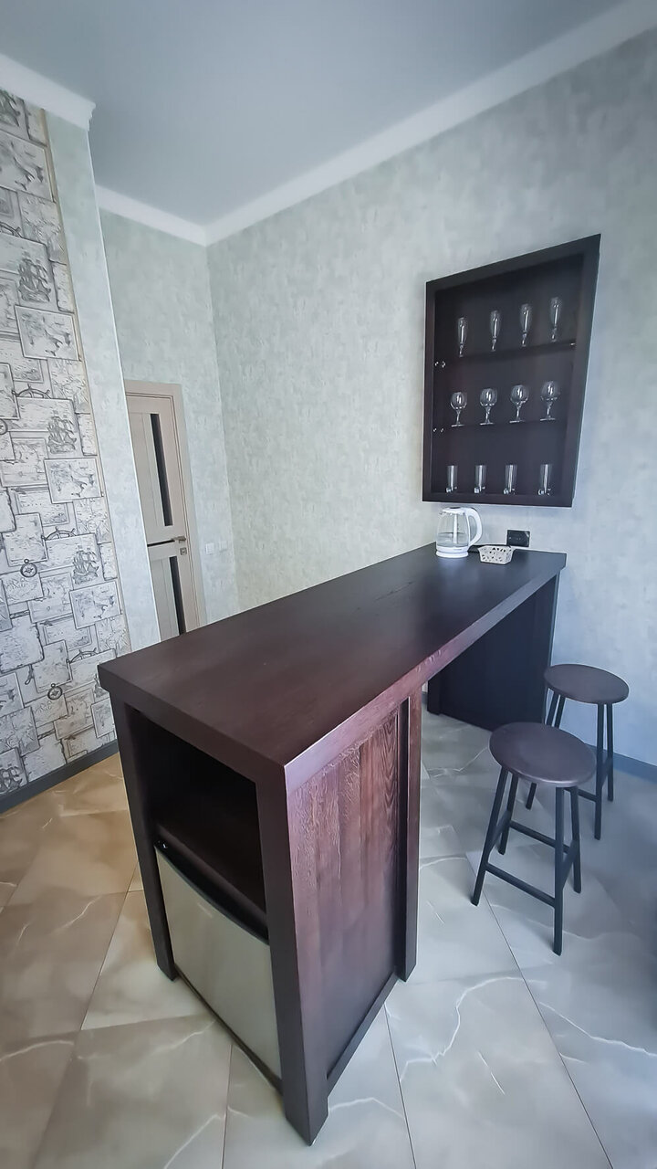 Гостиница слишком громко звучит для данного места, максимум придорожный отель повышенной комфортности. Хоть и расположен в Абрау-Дюрсо, но до центральной набережной идти далеко, рядом только одно приличное кафе, с относительно доступными ценами.Территория не комфортная. Бассейн радует в основном детей. Периодически в воздухе пахнет нечистотами. С дороги постоянно шум и пыль. Освещение в номере слабое — потёмки. Интересно подобраны стулья к барной стойке