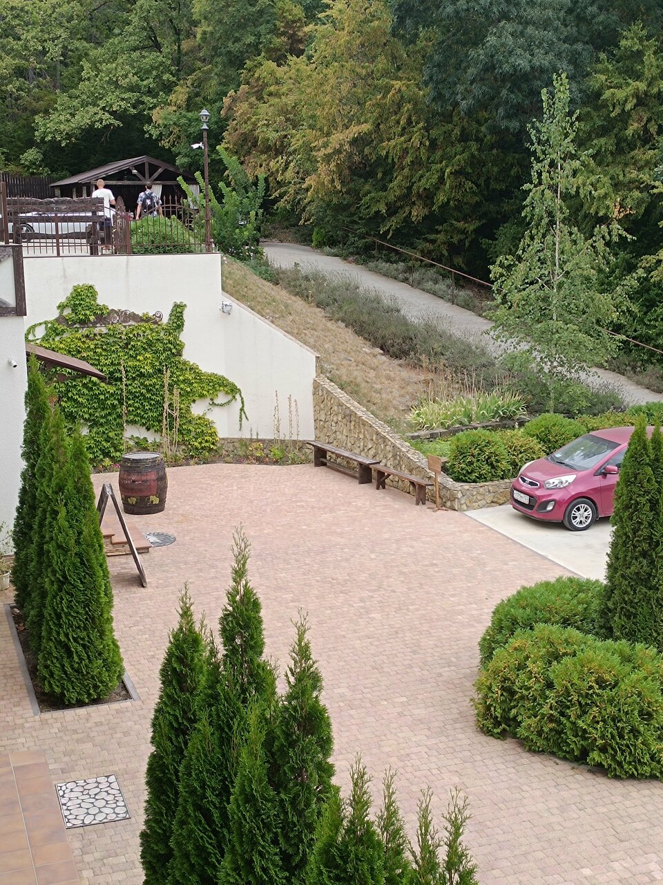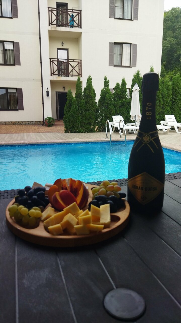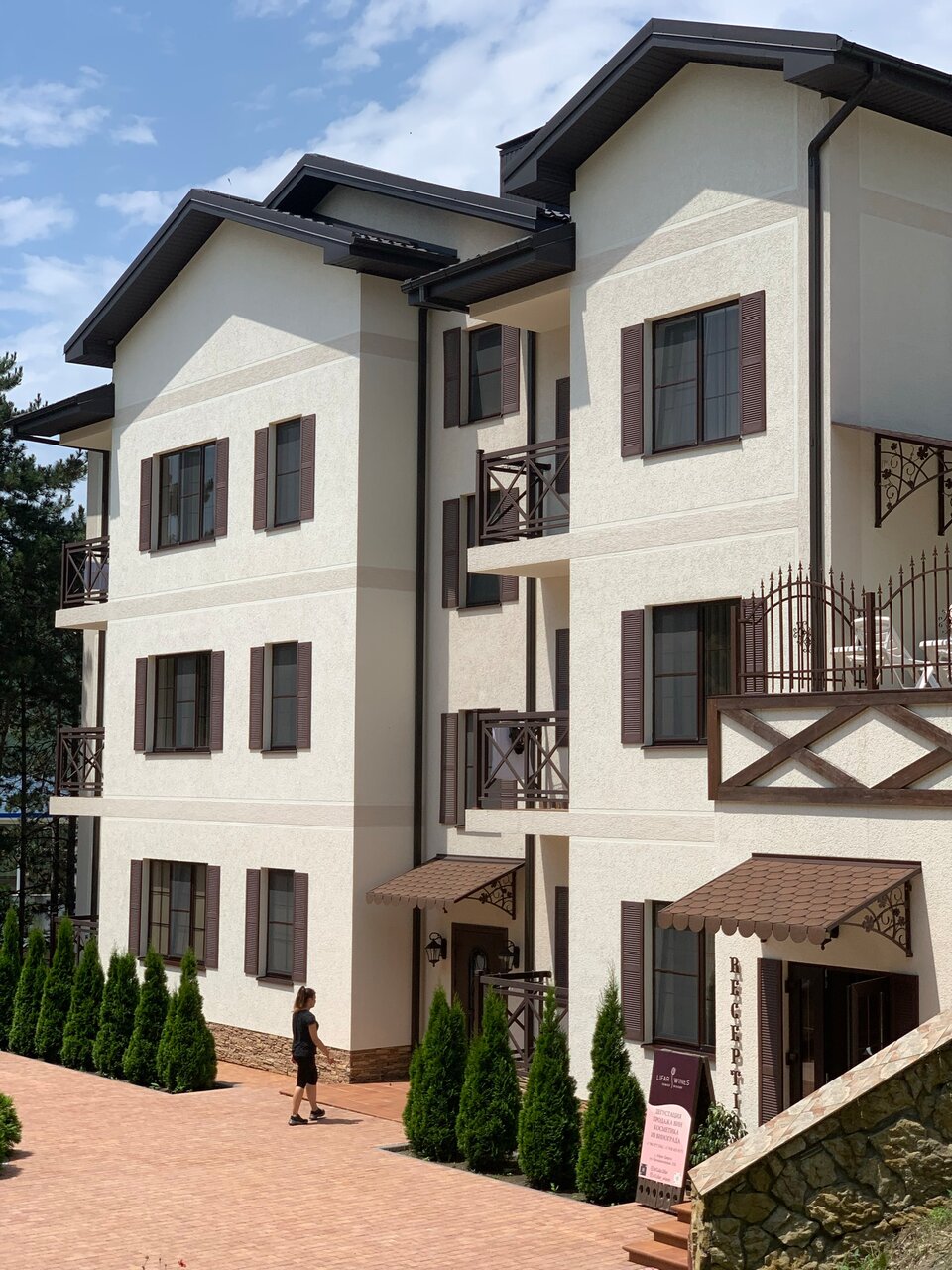 Ничего плохого об отеле сказать нельзя — чистый и немноголюдный бассейн, аккуратные, но не самые стильные (в советском духе) номера, вежливый персонал в общем цена/качество вполне удовлетворительные, на ту самую четвёрку. Из минусов — нет кафе/ресторана при отеле, чтобы поесть — надо спускаться вниз (да, имейте в виду, что отель на возвышении и обратный путь от озера хоть и недлинный, но очень крутой). Также гостиница позиционируется как с собственной винодельней, и может она там и есть 🙂 но за все время пребывания нам никто ничего не предложил и словом про неё не обмолвился.
