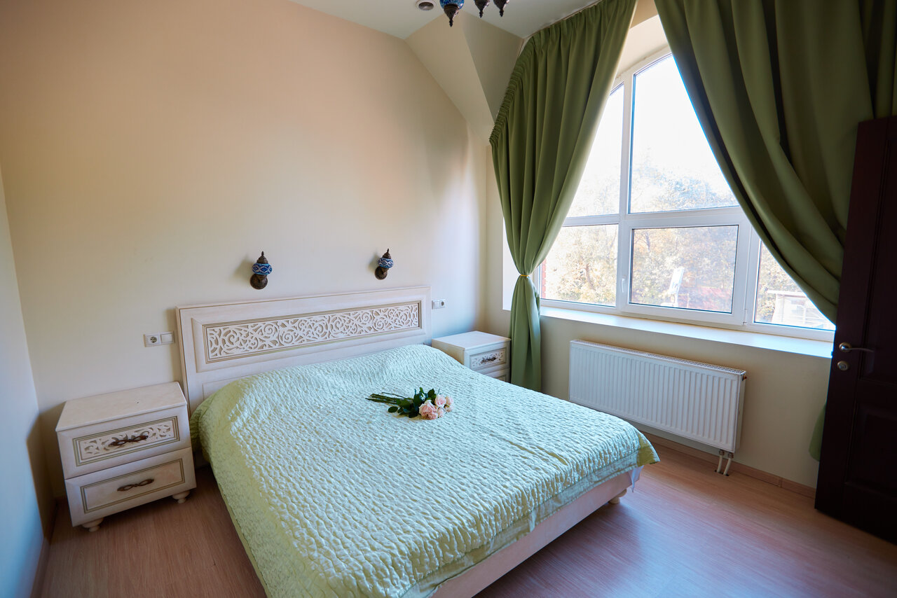 Двухкомнатный номер Люкс с гидромассажной ванной, двуспальной кроватью, раскладным диваном, ТВ. Сутки - 5000 руб., или почасовая оплата.