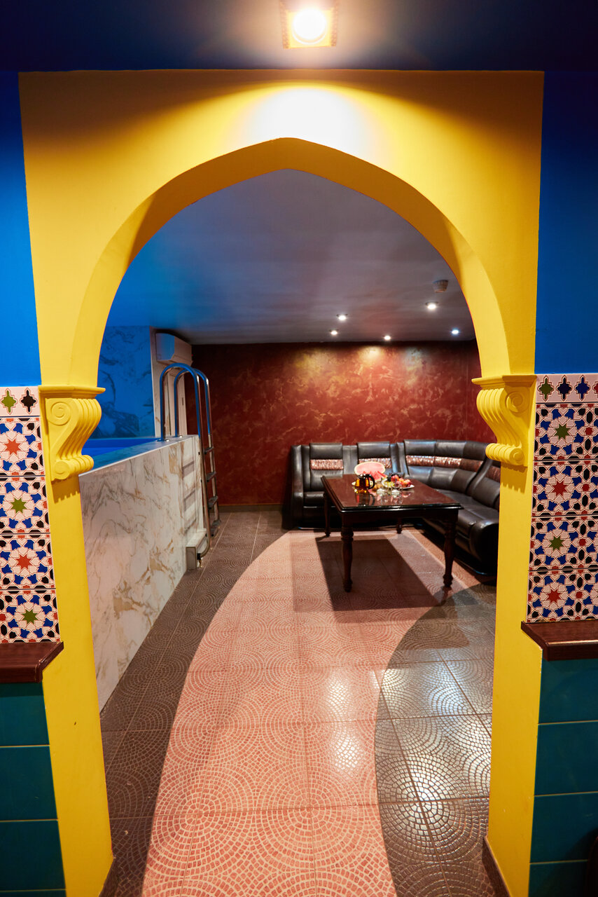 Сауна с джакузи, большой диван, караоке, ТВ, комната отдыха. Вместимость - 6 человек. Минимальный заказ - 2 часа.
