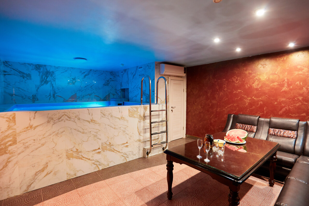 Сауна с бассейном, гидромассаж, караоке, большой стол, диван, ТВ, комната отдыха. Минимальный заказ - 2 часа. Вместимость - 6 человек.