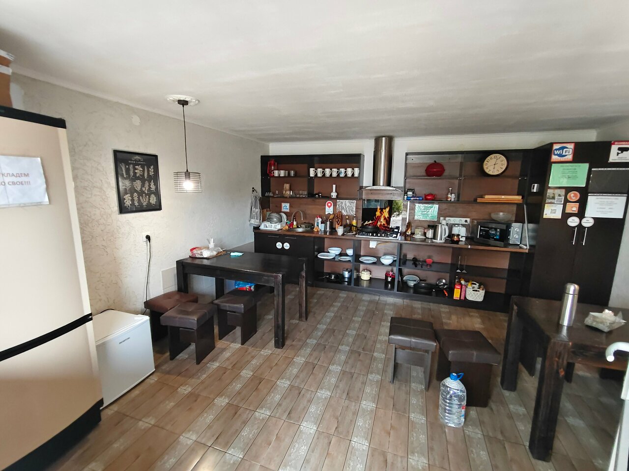 общая кухня с чаем и кофе. на завтрак каша и свежие яйца. каждый готовит сам. очень понравилось. есть номира с кондиционером и телевизором!