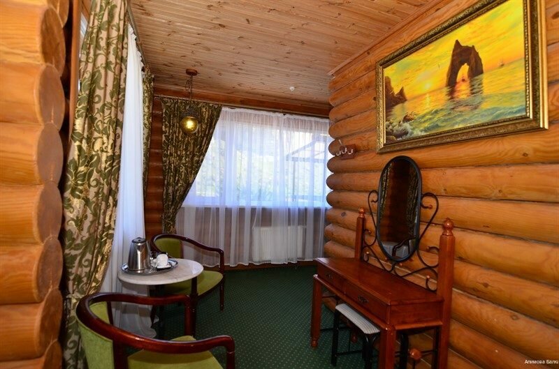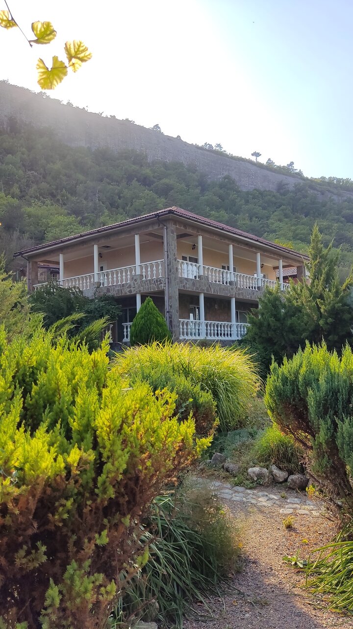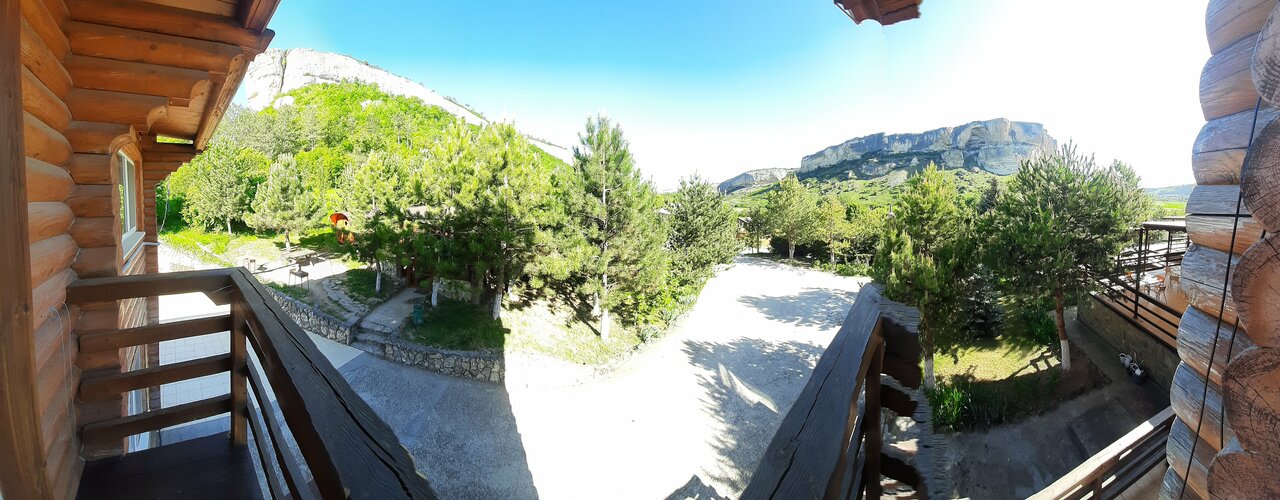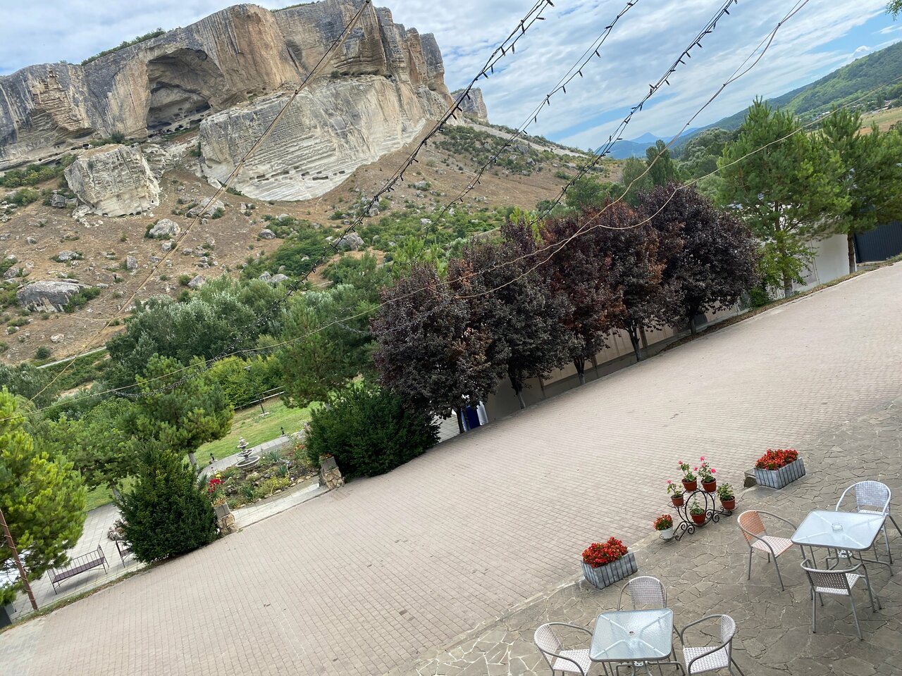 Гостиница на 3 звезды, обслуживание никакое, особенно в ресторане. Есть ещё негативные моменты по номеру. Не работал кондиционер, не спускала раковина. Номер снимали за 7500. В ресторане лучше не завтракать. Обычную яичницу и ту испортили. В 11 нужно было покормить ребёнка, кухня закрылась на банкет и досвидули. Кофе как нафталин. Чайник чая за 300 рублей с плавающими советскими чаинками едва подкрашеный и чуть тёплый принесли. Но вид на скалу всё компенсирует! Место волшебное! Большая территория, можно покататься на лошадках, погулять по саду.