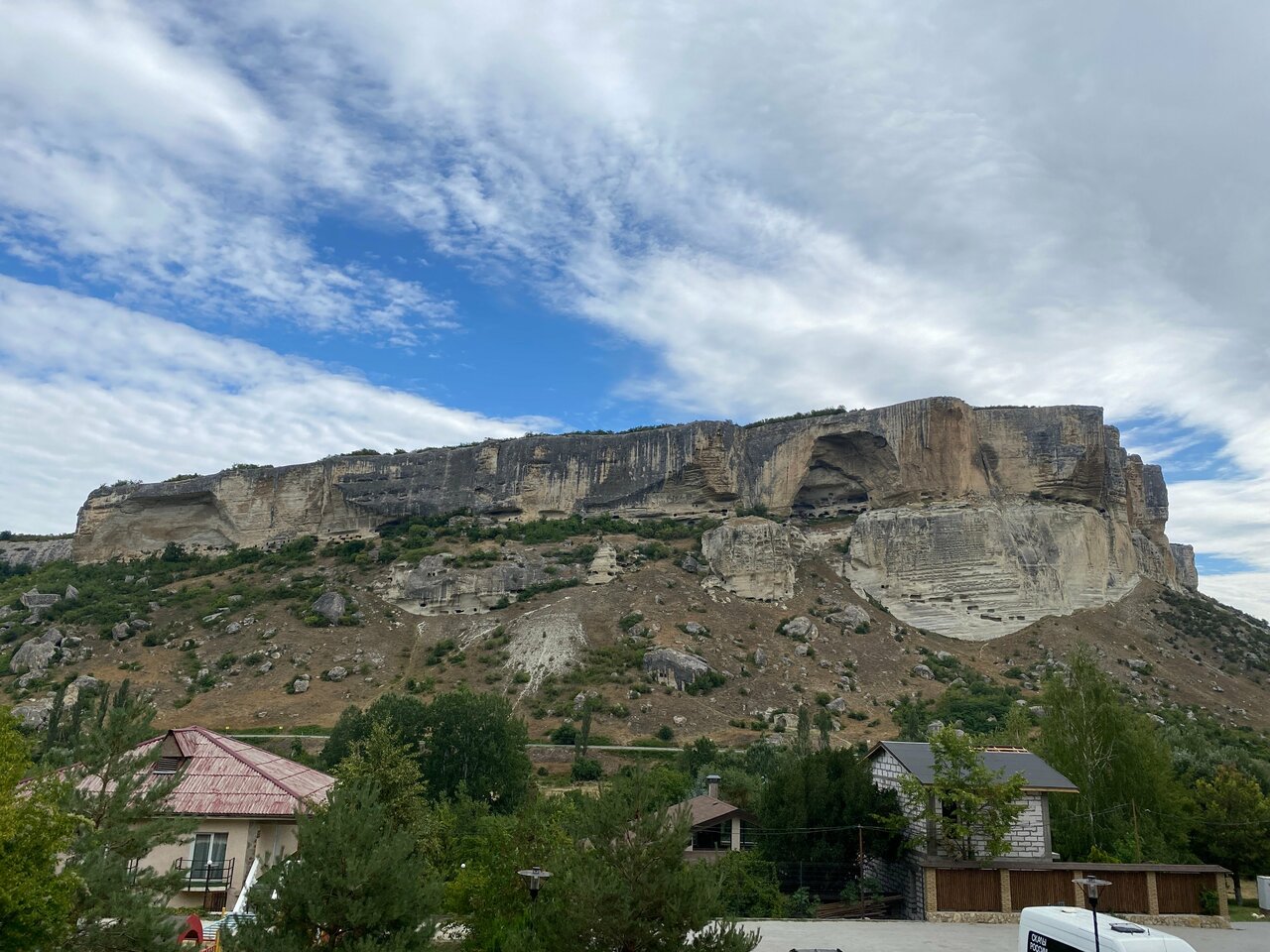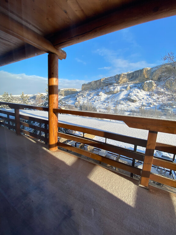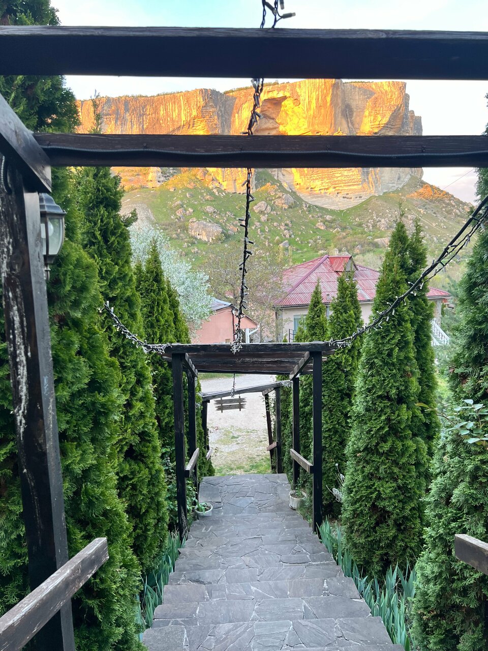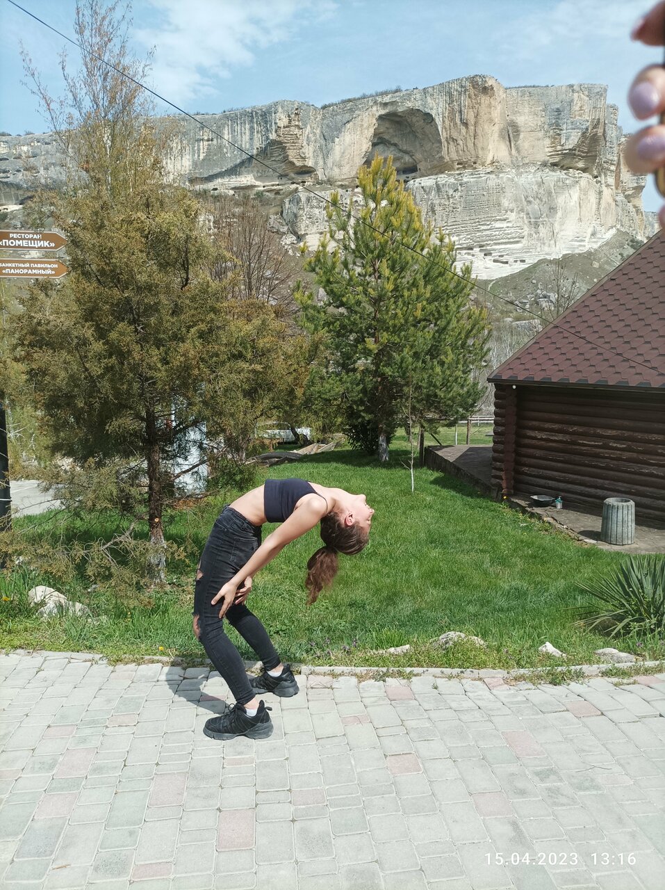 Гостиница на 3 звезды, обслуживание никакое, особенно в ресторане. Есть ещё негативные моменты по номеру. Не работал кондиционер, не спускала раковина. Номер снимали за 7500. В ресторане лучше не завтракать. Обычную яичницу и ту испортили. В 11 нужно было покормить ребёнка, кухня закрылась на банкет и досвидули. Кофе как нафталин. Чайник чая за 300 рублей с плавающими советскими чаинками едва подкрашеный и чуть тёплый принесли. Но вид на скалу всё компенсирует! Место волшебное! Большая территория, можно покататься на лошадках, погулять по саду.