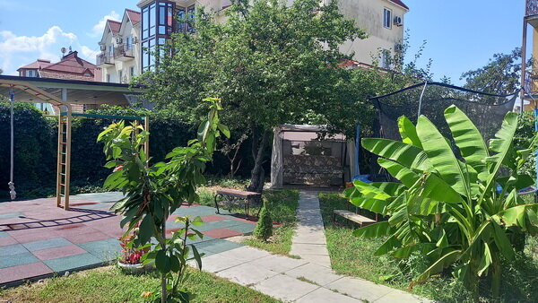Из плюсов Большие номера ,в номере есть чайник ,мини холодильник , кондиционер,большой балкон с сушкой для белья ,на этаже есть так же чайник ,утюг доска . Большая мангальная зона. Есть качели,детский батут . Кухня со всем необходимым ,два холодильника , можно спокойно готовить еду . По всей территории фруктовые деревья .