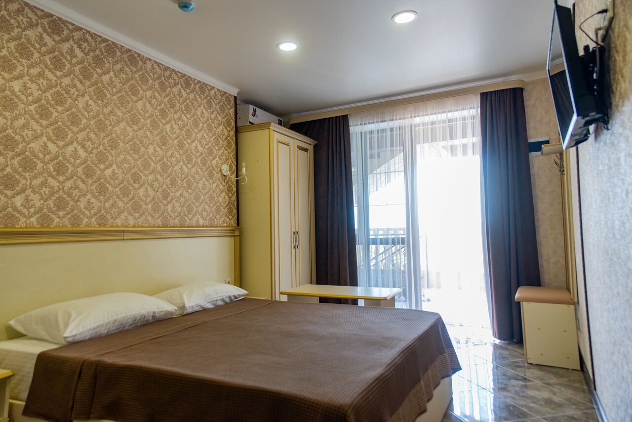 Уютный номер для размещения от 2 до 4 человек? от 20 до 24 м2. В комнате одна большая кровать и раскладной диван, рабочая зона, чайник, ТВ, кондиционер, шкаф. В ванной комнате: фен, душ, санузел, комплект полотенец. Бесплатный WiFi