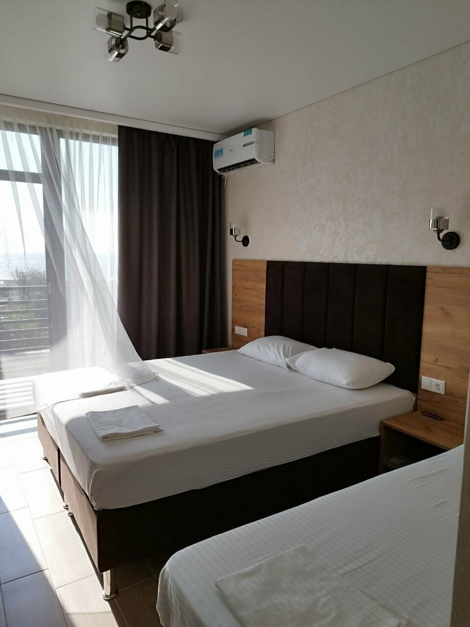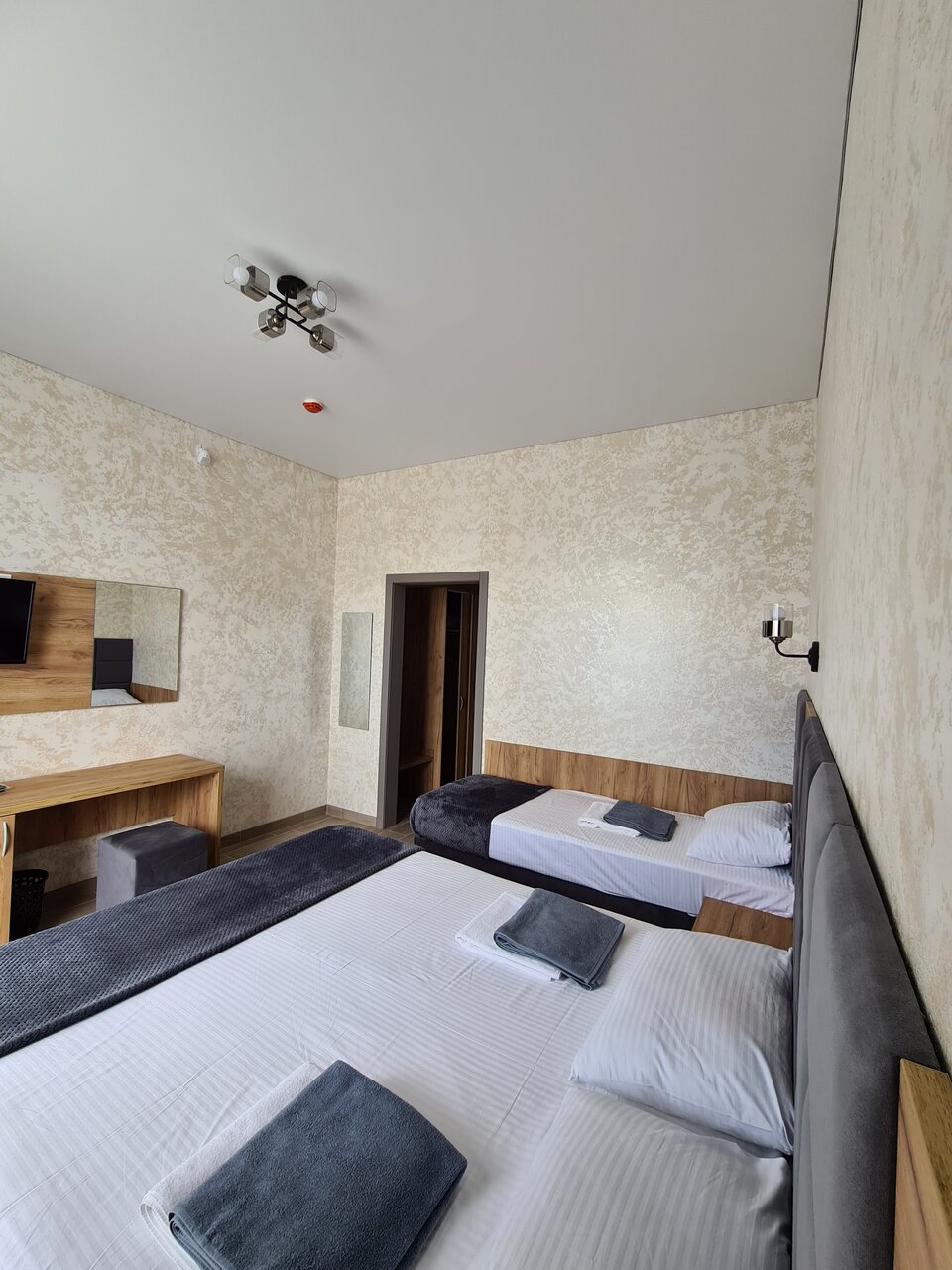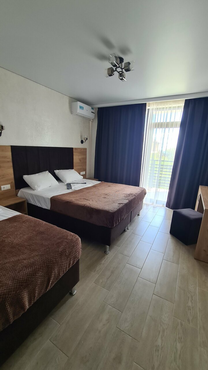 Отель рядом с морем. Стоянка 400 метров от отеля не удобно. Оплата на карту или наличными. При заселении вошли в номер там другие люди спят, вернулись на ресепшен, оказывается наш номер отлали другим. Дали другой номер, у нас было плюс одно место, кровать не принесли, сказали работников нет, несите сами с третьего этажа на первый, фото прилагаю. После 3х дней попросили убрать в номере вынести мусор, нам заявили, что мы сами убираем и выносим мусор. Пакеты для мусора , веник и савок возле кулера. Нет чайника в номере не удобно. В номере жили 5 человек, дали одну карту от номера, попросили ещё одну, отказали. Хозяин ругал нас при выселении, мол песок на кровати, но за 8 дней не разу не убрались и не выносили мусор