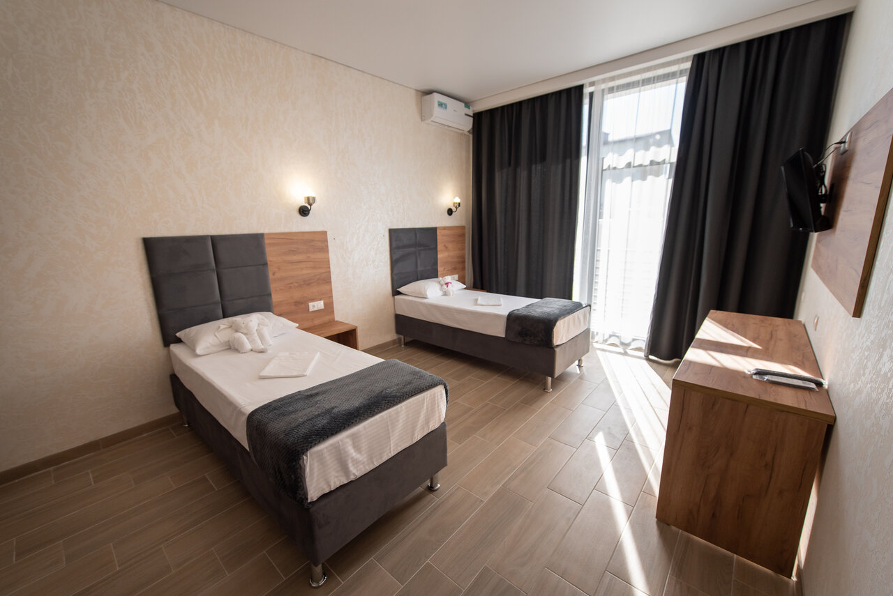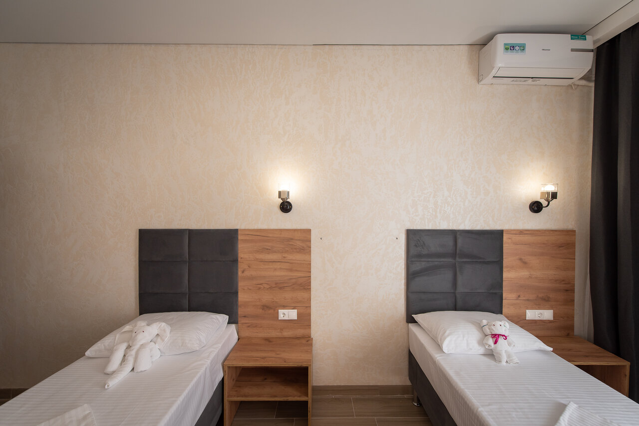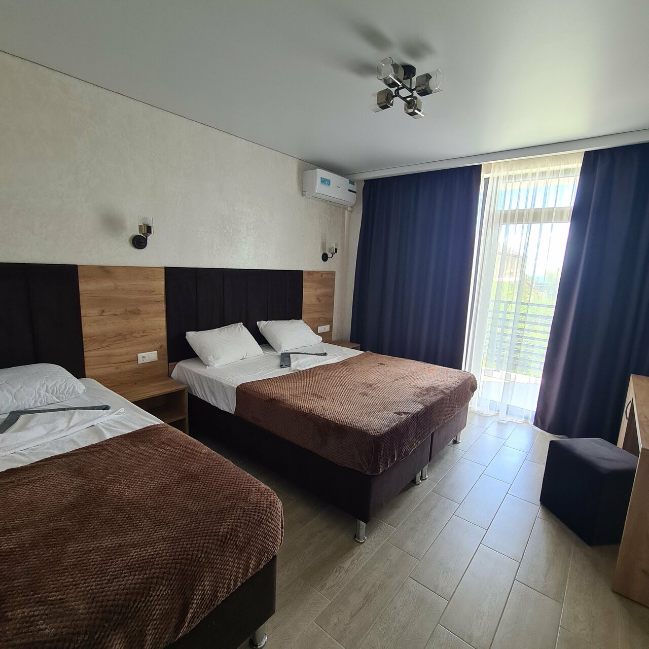 Отель рядом с морем. Стоянка 400 метров от отеля не удобно. Оплата на карту или наличными. При заселении вошли в номер там другие люди спят, вернулись на ресепшен, оказывается наш номер отлали другим. Дали другой номер, у нас было плюс одно место, кровать не принесли, сказали работников нет, несите сами с третьего этажа на первый, фото прилагаю. После 3х дней попросили убрать в номере вынести мусор, нам заявили, что мы сами убираем и выносим мусор. Пакеты для мусора , веник и савок возле кулера. Нет чайника в номере не удобно. В номере жили 5 человек, дали одну карту от номера, попросили ещё одну, отказали. Хозяин ругал нас при выселении, мол песок на кровати, но за 8 дней не разу не убрались и не выносили мусор