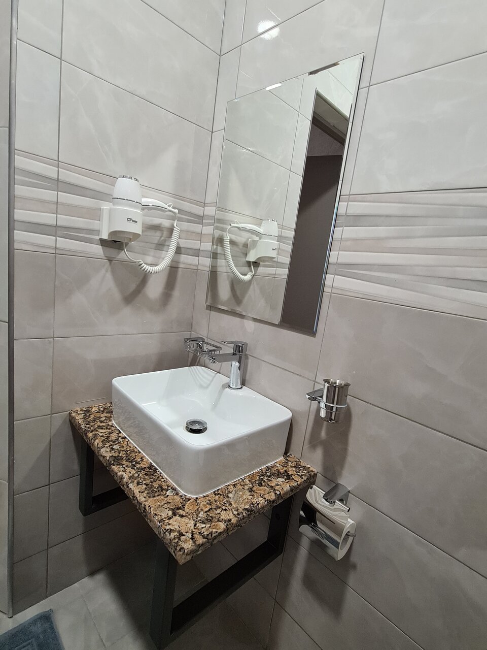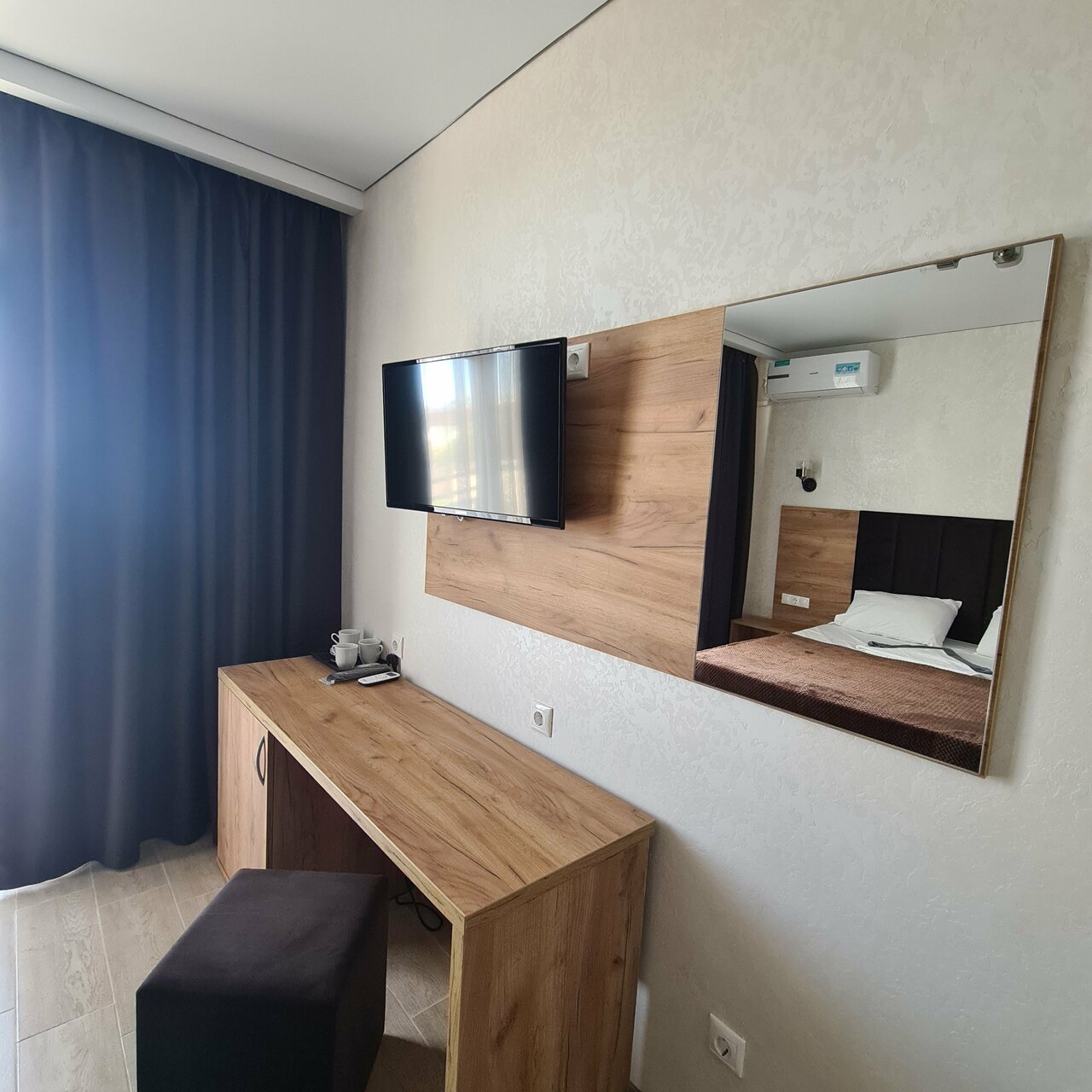 Отличные чистые и просторные номера, хорошая сантехника и мебель, комплект полотенец и мыльно-рыльных принадлежностей. В гостинице есть столовая, территория для посиделок вечером а так же зона бассейна для детей и взрослых. Приветливый персонал, уборка в номере по требованию. Очень понравилось, приедем сюда еще!