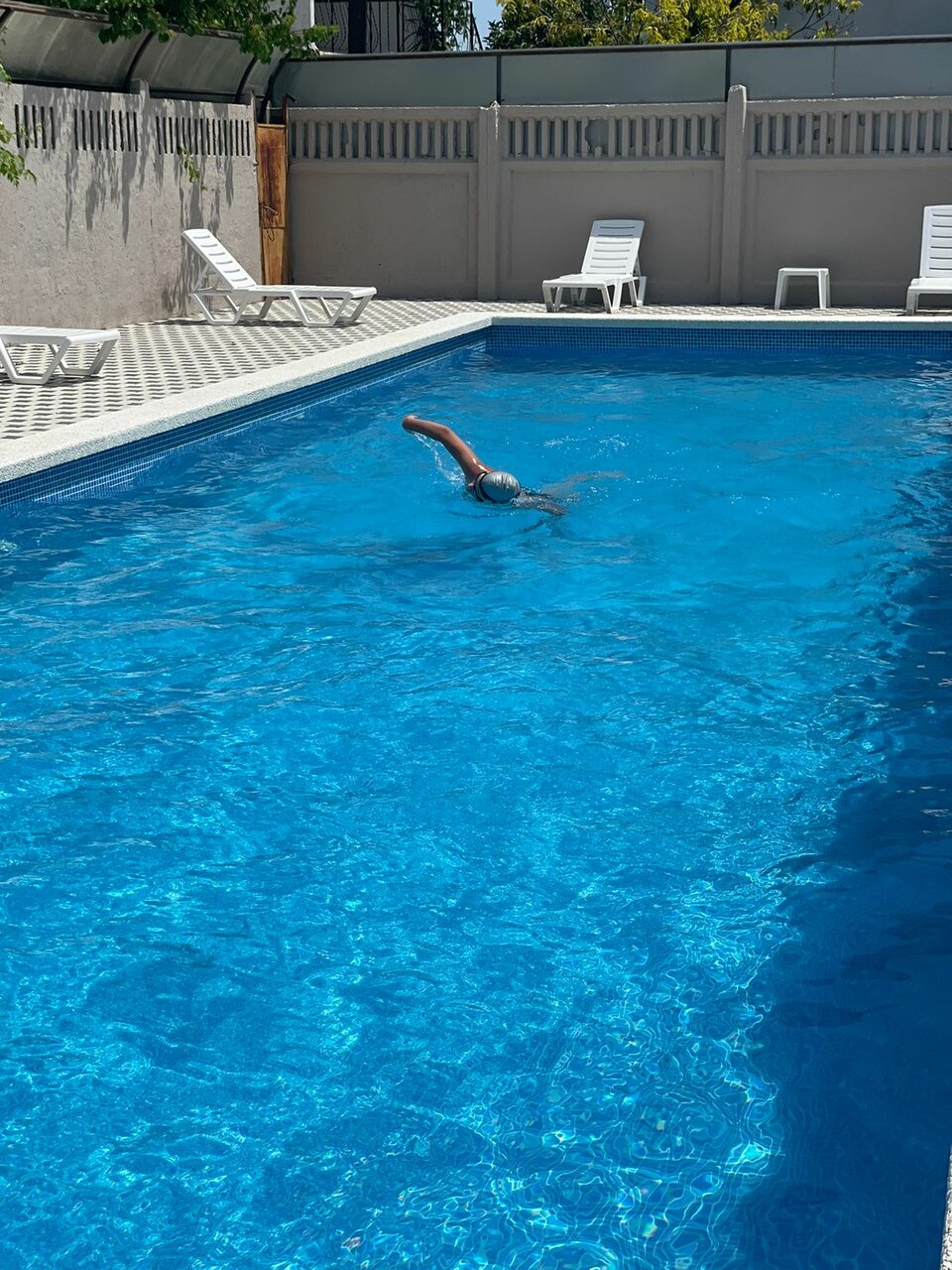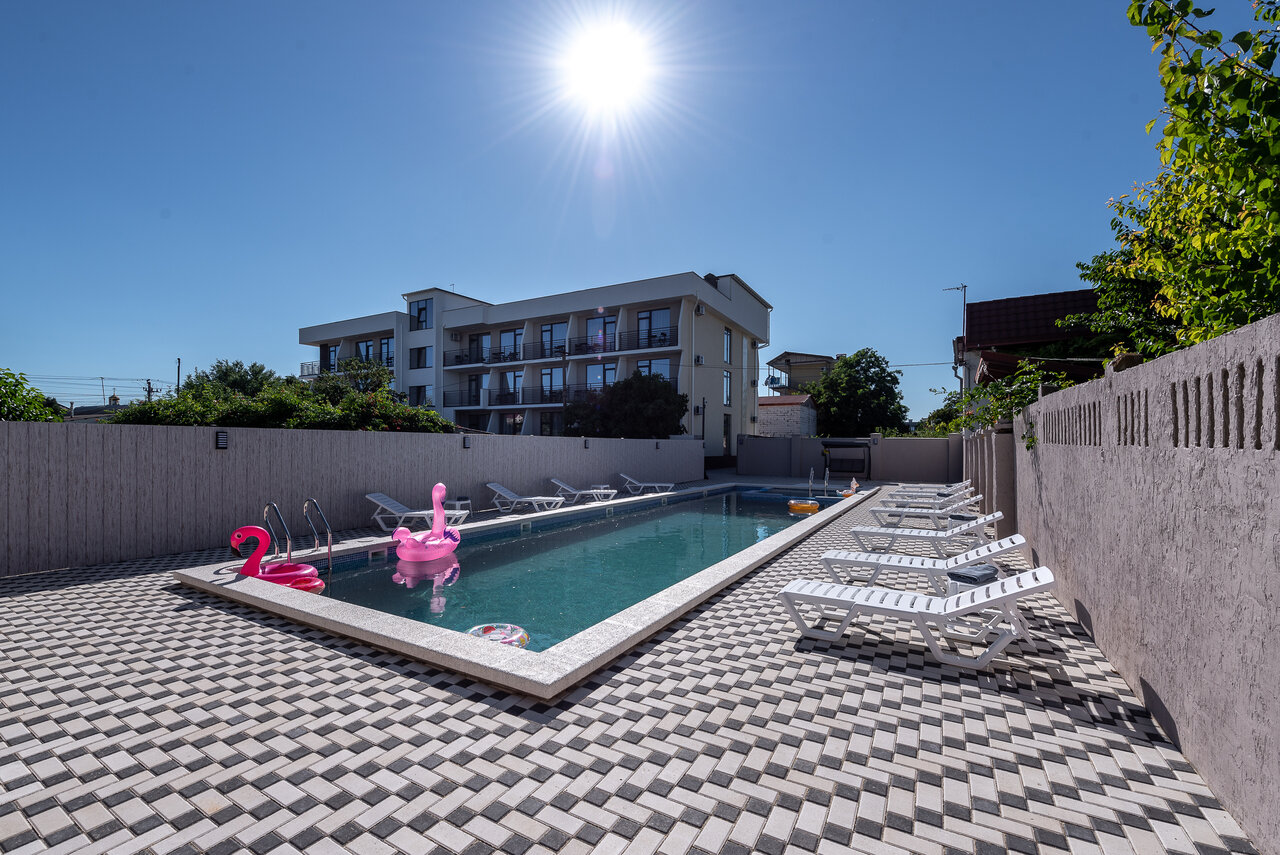 Лучший отель в Береговом! Новый, чистый, современный, с бассейном и очень близко в морю, буквально через дорогу. При этом отель находиться на тихой улочке, шум машин с Керченского шоссе и музыки из баров вдоль него не слышно. Рядом столовые и магазины. В следующем году столовую планируют открыть и на территории отеля. На территории растут гранатовое и инжирное деревья. Хозяин очень радушный, вместе с персоналом стараются, чтобы гостям было удобно. Мы отдыхали в конце августа 2022г, отель открылся в июле. Некоторые номера еще были неукомплектованы полным набором мебели, но мы выбрали уже готовый и прекрасно отдохнули. Спасибо, Медея!