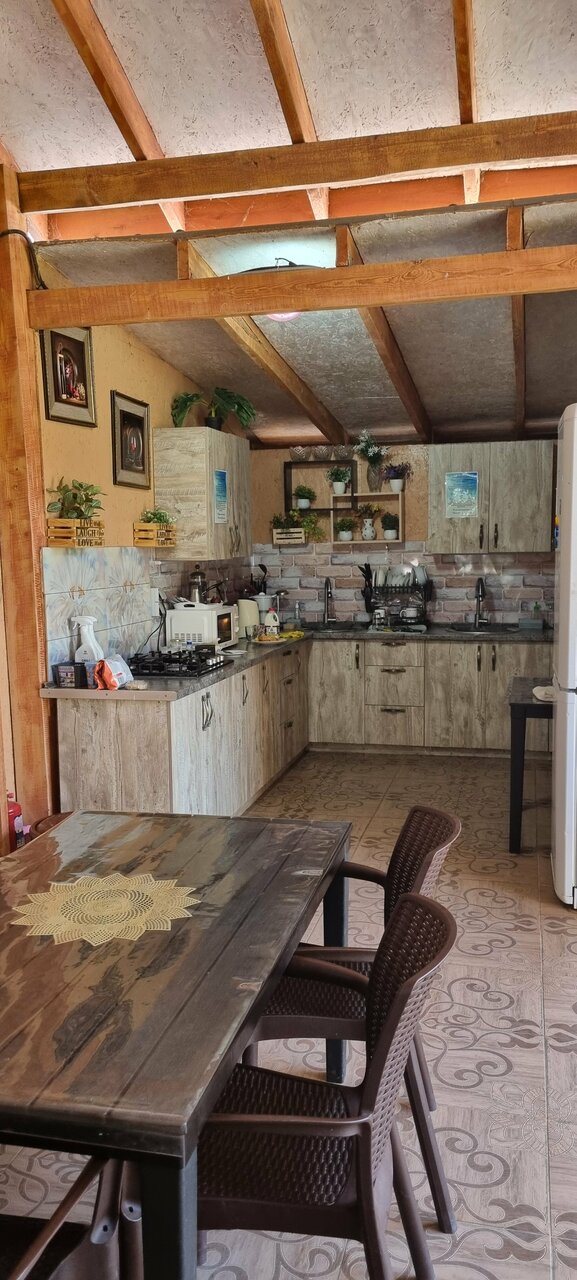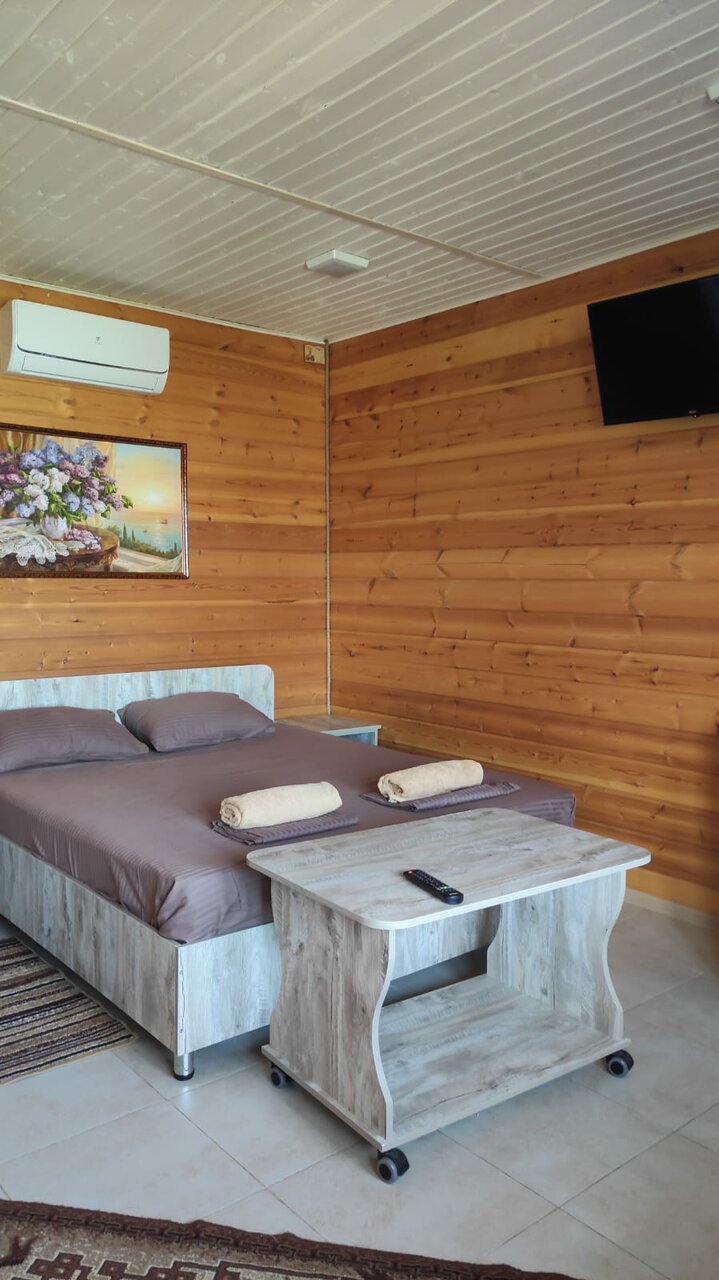 Прекрасный вариант для отдыха в Крыму. 5 минут приятной прогулки до пляжа. Уютные номера. Приятный аромат дерева из которого выполнено строение. Кухня и столовая удобная и комфортная выделена в отдельную зону. Есть монгальная зона и игровая зона для детей. На территории имеется бассеин. А самое главное это очень радушные хозяева, большое спасибо им за радушие и тёплое гостеприимство, порядок и чистоту.