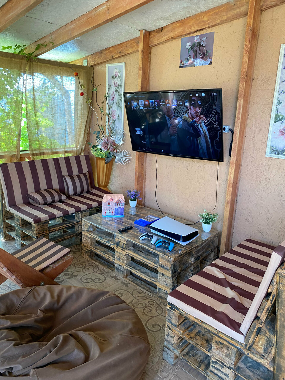 Отличное место для семей с детьми! Бассейн, спортивные горки, тренажёры, качельки, два батута, беседка отдельная с игрушками, PlayStation. Все для детского счастья. Огромная территория, украшена цветами, клумбами, беседки, качели. Отельная кухня с таким вкусом оформлена! И такая чистая! Есть все! Кастрюли, посуда, кружки. Холодильник, микроволновка, чайники. Столиков несколько, на каждом цветочки. Сами номера в двухэтажном здании. Номера с отдельным входом, есть столик с креслами возле входа, сушилка для белья и огромным количеством прищепок. Сам номер в современном изысканном стиле. Матрасы ортопедические. Тв, холодильник. Все очень уютно. Но изюминка и самое лучшее в этом отеле — хозяйка — источник вечного солнца и тепла!!! Любые проблемы, вопросы, просьбы — моментально будет решено. Спасибо большое