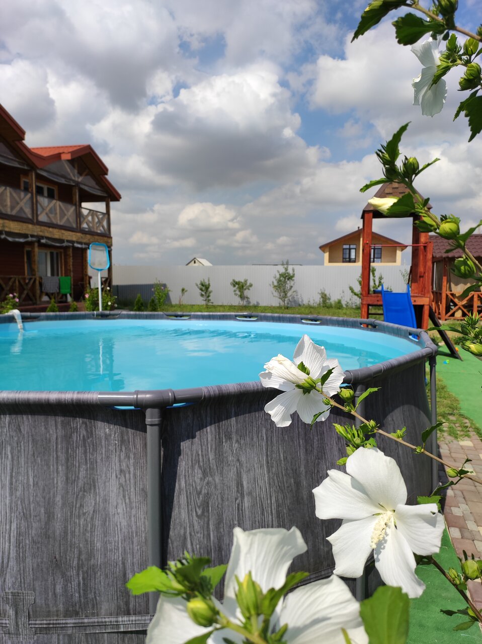 - Ухоженная территория с бассейном, беседками, мангалом, цветами.