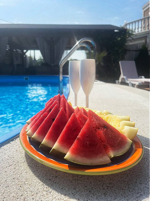 - Видеонаблюдение и безопасность.; Наличие бассейна с тёплой водой.; Уютная и стильная обстановка.; Искренняя забота о гостях.; Белое постельное бельё и посуда.