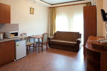 Насладитесь отдыхом в просторном номере УЛУЧШЕННЫЙ с двумя зонами: светлая спальная и гостиная с мини-кухней. Из больших панорамных окон открывается прекрасный вид на близлежащие окрестности и территорию гостевого комплекса. Воспользуйтесь всеми преи